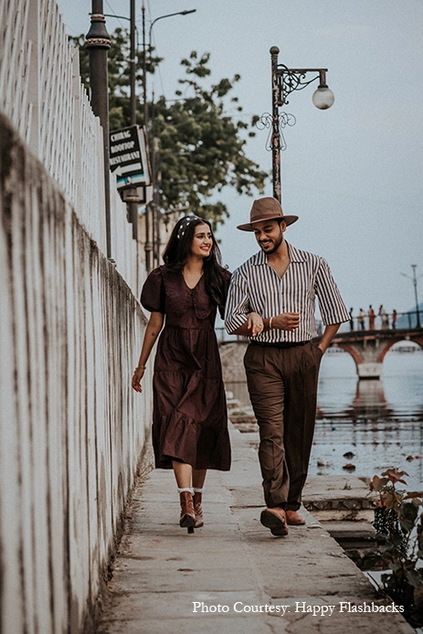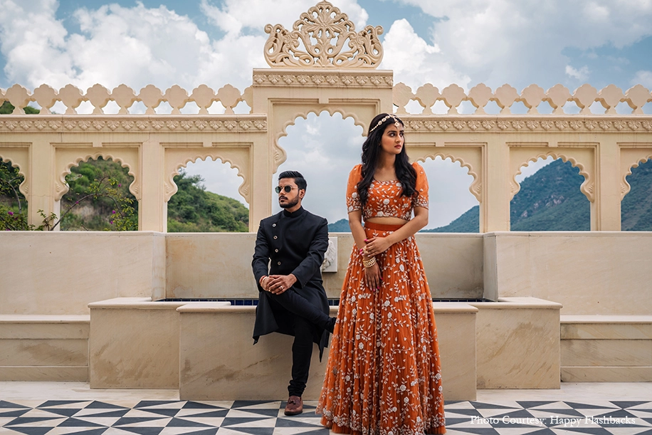 Backed by the gorgeous heritage architecture of Udaipur and its untouched nature, Aashi Aggarwal, an Interior Designer and Ojas Tulsyan, a scientist’s pre-wedding photoshoot was a curious mix of desi-meets-retro style. From romantic shots under the azure sky to stylistic shots backed by the vintage streets of the city, this photoshoot orchestrated by WeddingSutra Favorite – Happy Flashbacks was riveting and yet romantic.