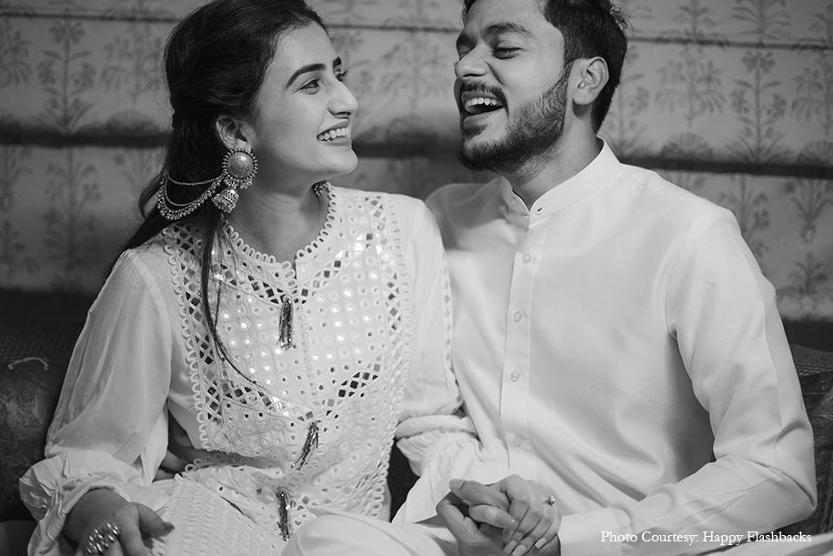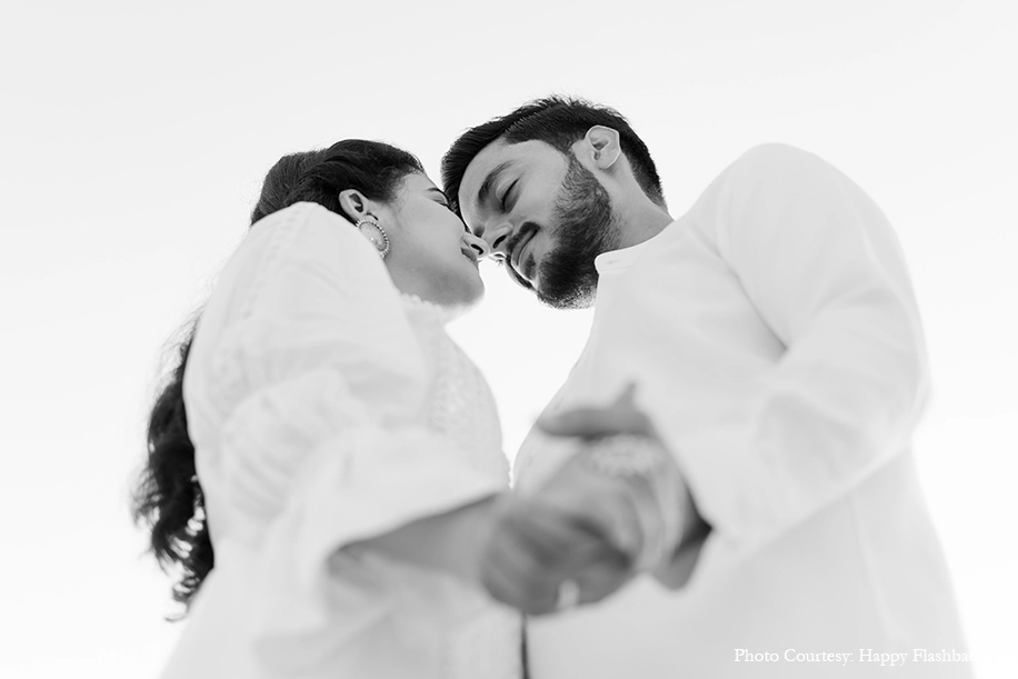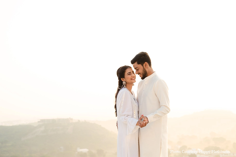 For their pre-wedding photoshoot, the couple was keen on capturing the unique facets of their relationship, and what better backdrop than the beautiful city of Udaipur? Ojas shares, “It was one of our first ever shoots that we were planning. Naturally, we were clueless about what to do or what was required. The photography team was a great help throughout the planning process. They first wanted to get acquainted with our vision. We had always imagined a location that offered some royal aesthetics. Aashi had long nurtured a fascination for Udaipur, so it didn’t take long for us to zero down the location. About the theme and styling, we were clear about wanting an all-white look. The city is a maze of heritage architecture which made it obvious for us to pick a traditional look. The third look sported a casual vibe for which an 80’s inspired look caught our fancy. We were excited when we visualized that theme against the stunning backdrop of Udaipur! However, the couple did face some challenges when they missed their connecting flight from Delhi to Udaipur. While we reached there in the evening instead of earlier in the day as originally planned, the photography team had ample time to study the location. As soon as we reached, the team was expecting us and we started gearing up with our make-up and outfits. We headed to the city where our travel agent guided us through a few spots by lake Pichola. The second day, we woke up early to catch the golden hour in order to get the best shots. The entire day was pretty high octane, we kept changing looks and spots on the go. We enjoyed getting clicked so much so, that nothing felt like a challenge beyond a point.