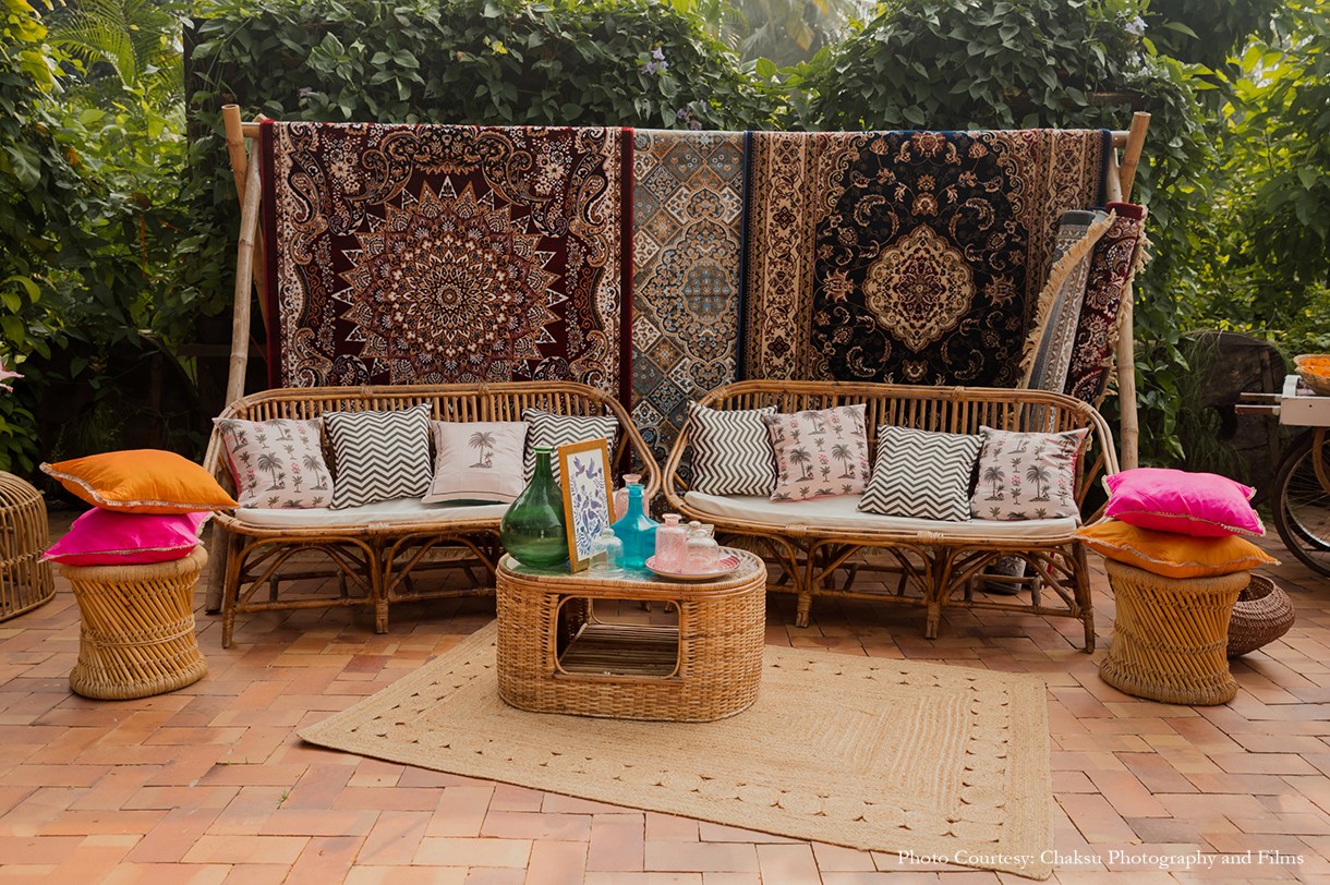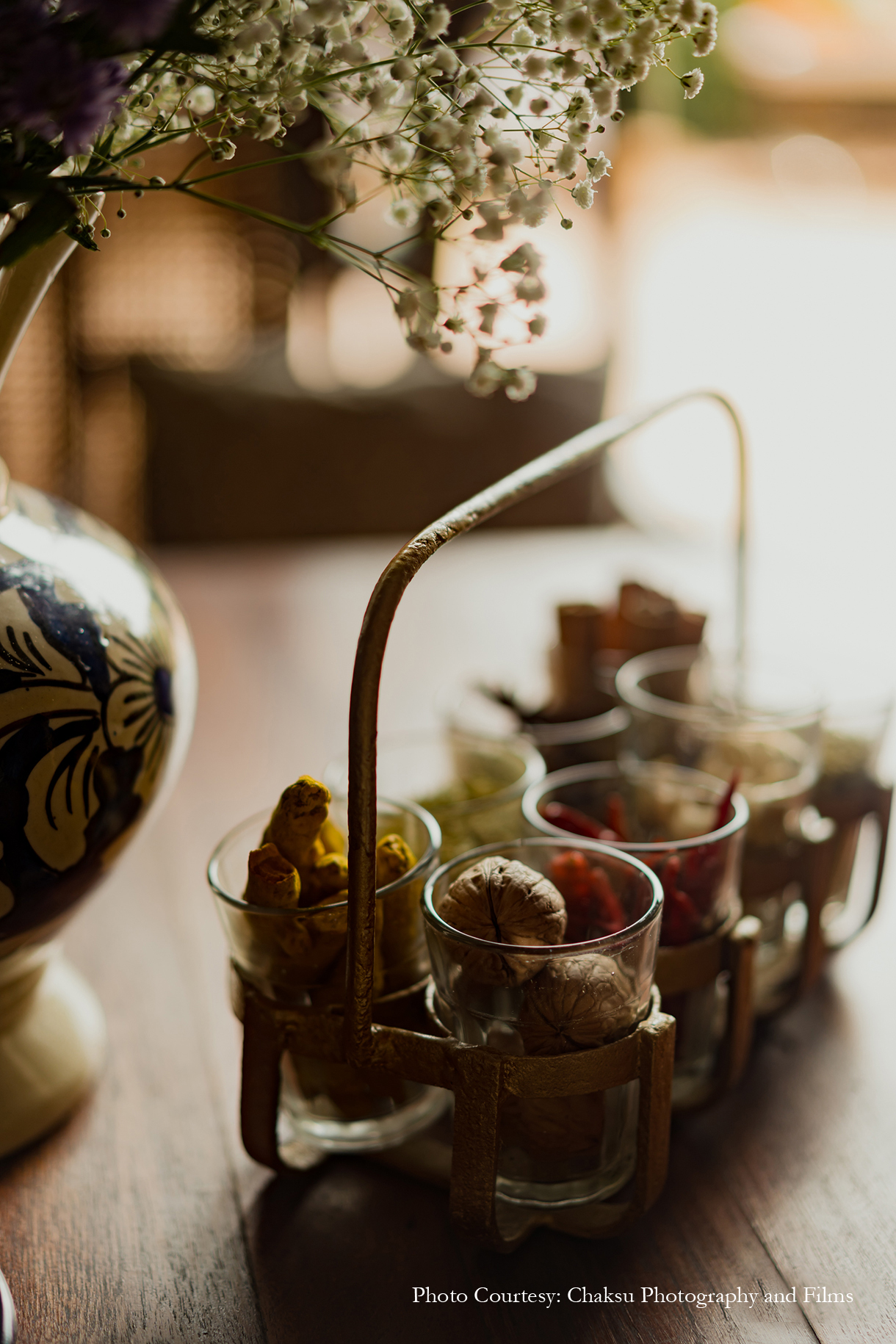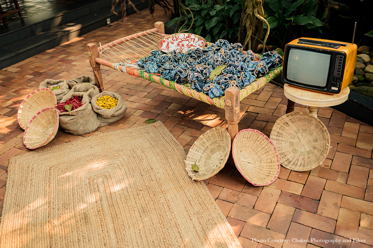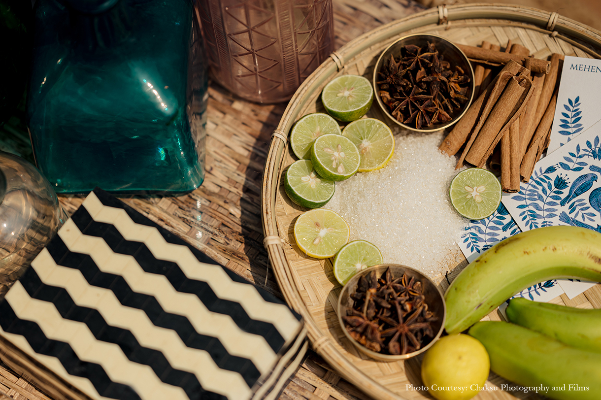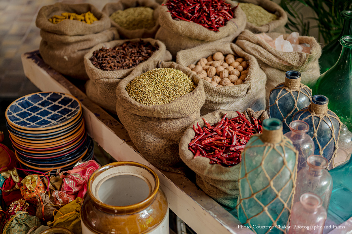 Dubbed The Old Spice Souk – an inspiration from the Middle East, the mehndi soiree was fittingly held at the Spice Studio in Alila Diwa Goa. Filled with jute bags full of vibrant spices, colorful pottery, terracotta items, rugs, wicker baskets, and more, the occasion held a warm, rustic vibe that perfectly accentuated the earthy atmosphere of the venue.