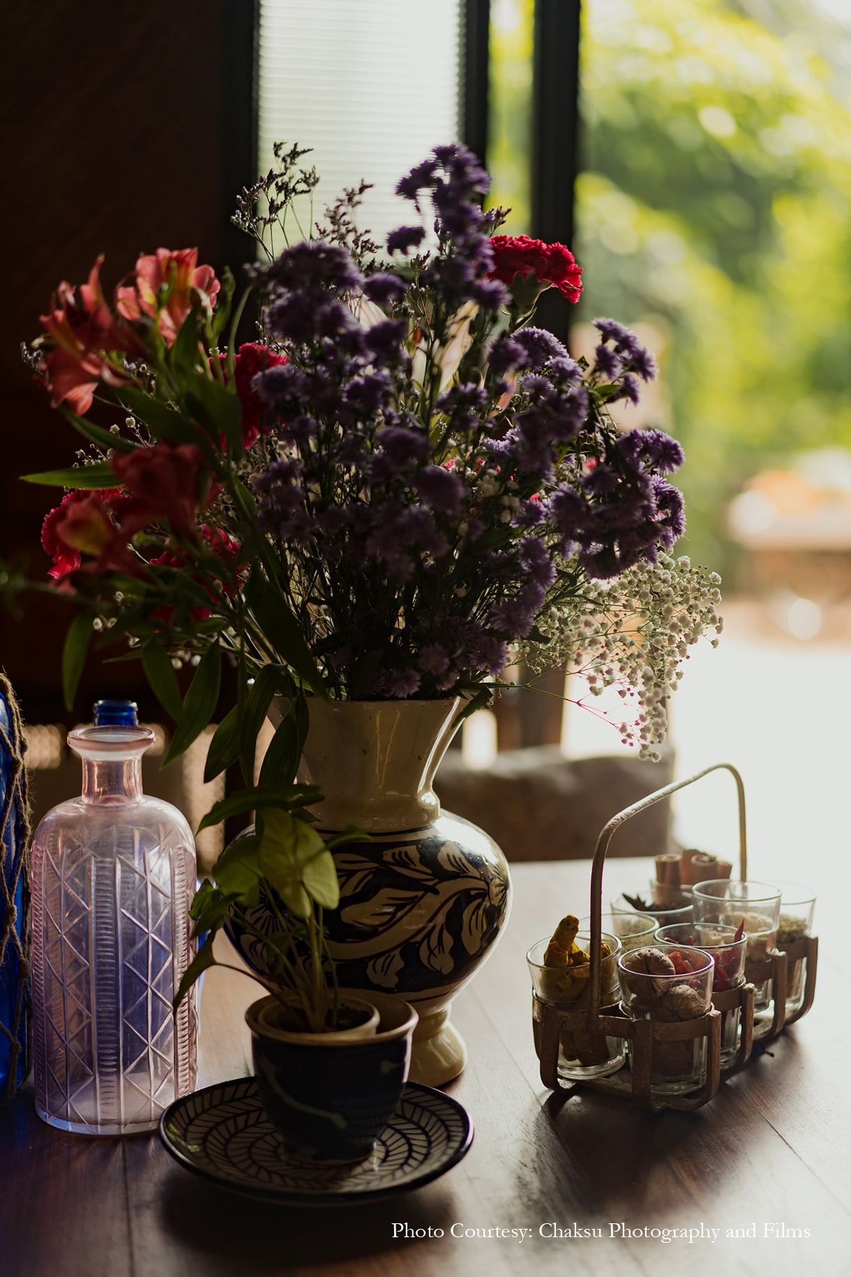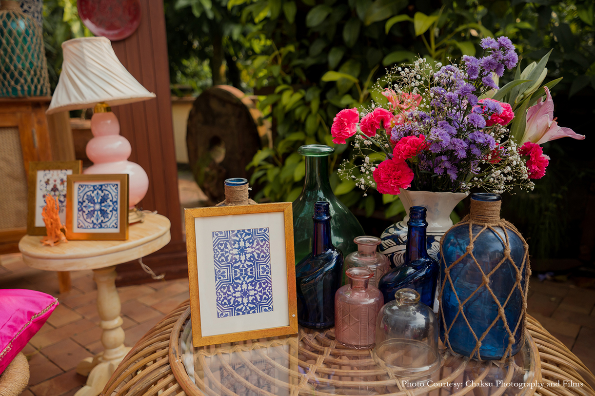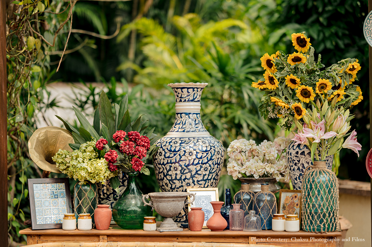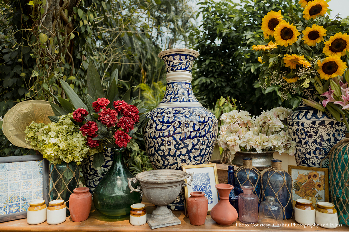 Dubbed The Old Spice Souk – an inspiration from the Middle East, the mehndi soiree was fittingly held at the Spice Studio in Alila Diwa Goa. Filled with jute bags full of vibrant spices, colorful pottery, terracotta items, rugs, wicker baskets, and more, the occasion held a warm, rustic vibe that perfectly accentuated the earthy atmosphere of the venue.