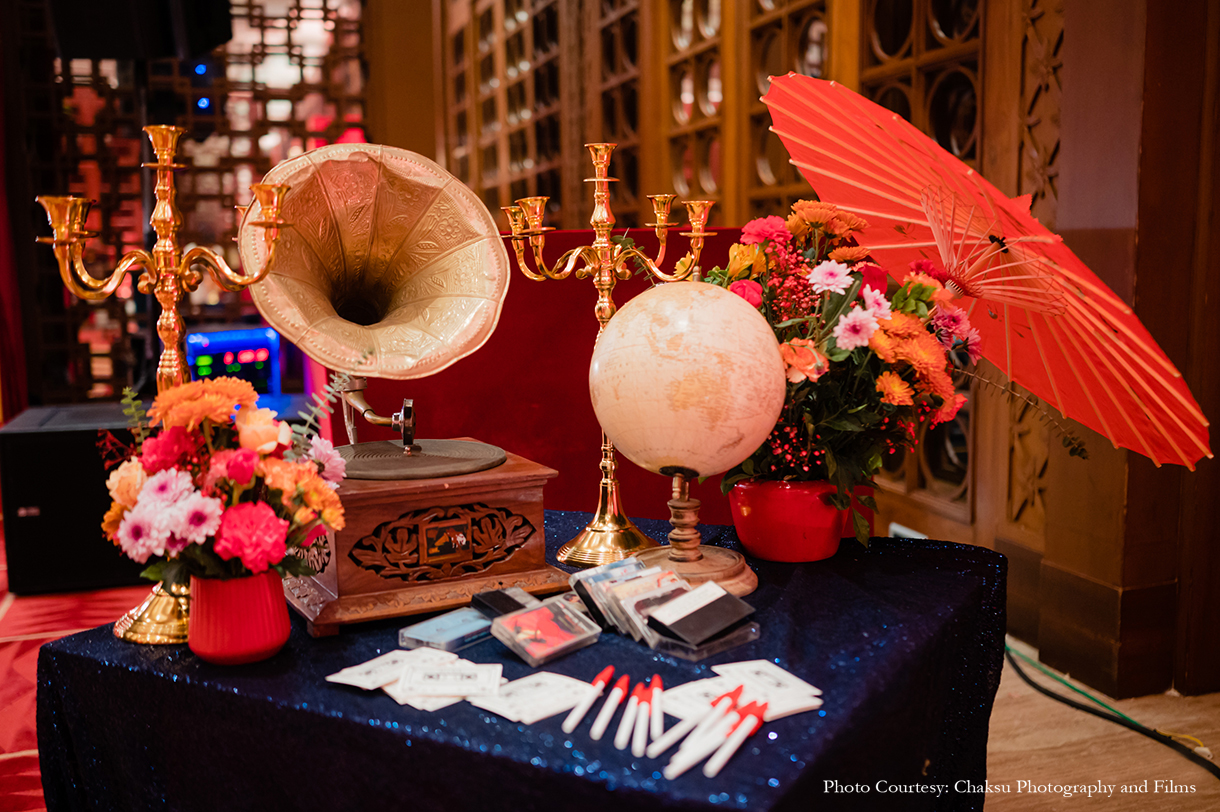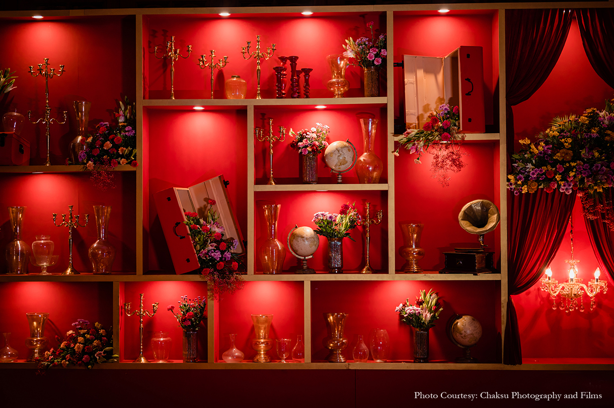 The riveting Sangeet evening takes you on a journey of Amsterdam’s Moulin Rouge, full of mystique and exotic elements. Crafted with vintage chandeliers, trunks full of flowers, record players, candelabras, and red drapes, the stage made for a captivating visual story, while antique memorabilia and other unique artifacts filled the space with their allure. It was called 50 shades of red, the perfect setting for a night of music, dance, and magical moments.