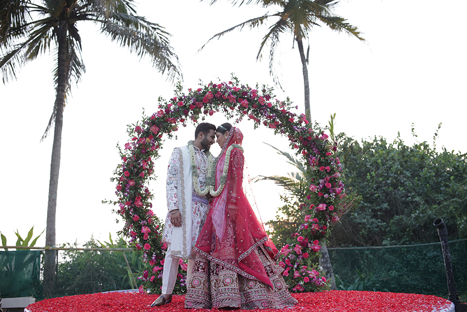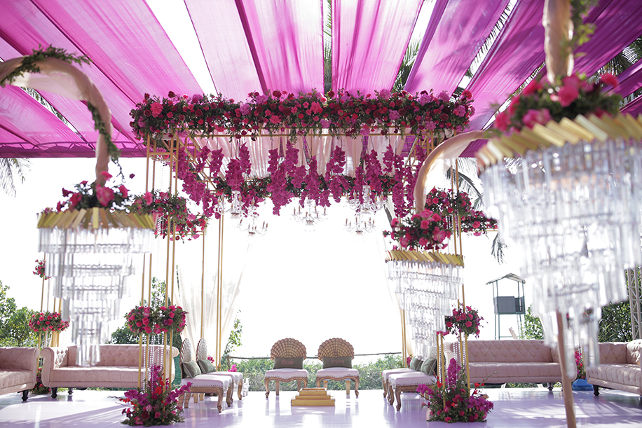 Fuschia blooms, ornate chandeliers and gold elements – this beachside destination wedding in Goa was dreamy!