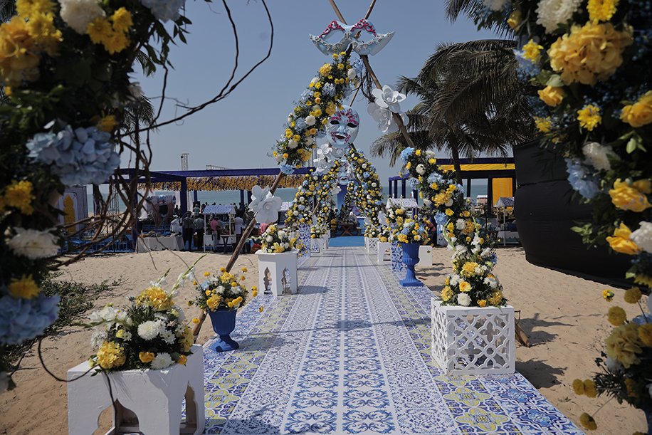 Day one kicked off with a beachside carnival and brunch which was also a perfect welcome for the guests who’d just landed in Goa. Raj Batra from Mosiac Events By Raj Batra shares, “It was a Greek-themed beach soirée infused with yellow hues for haldi. A host of entertainers, activities and global cuisine welcomed the guests to the venue right after the check-in. The couple made a stylish entry on a Thar SUV with the entire carnival entourage on the beach in tow.”