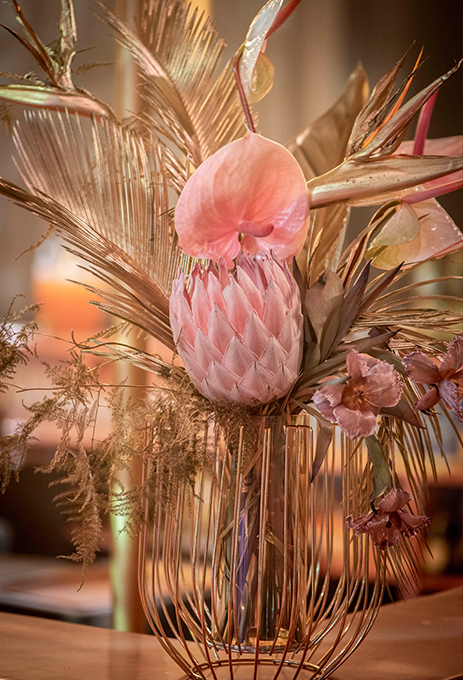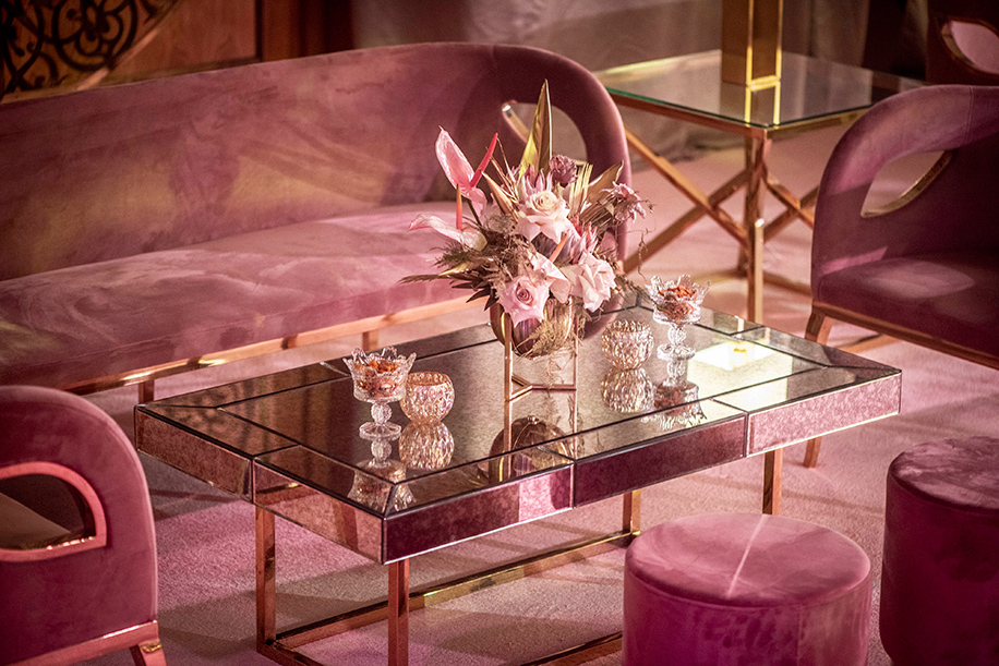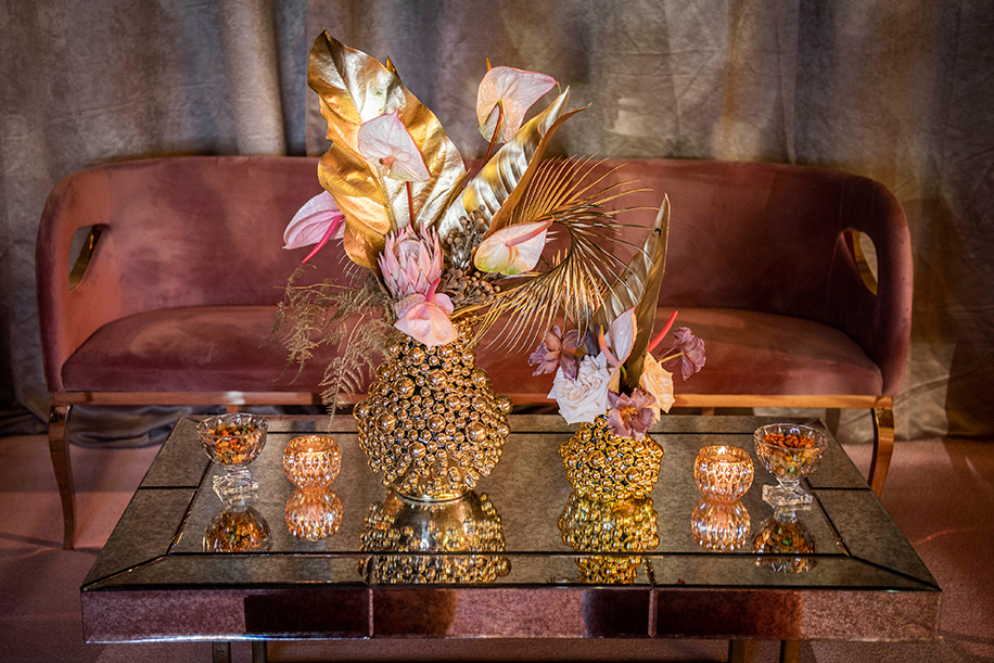 The lounge seating arrangement featured a velvet old-rose pink couch and a table decorated with crystal bowls, glass candle holders, and a metallic vase covered with golden balls, lots of dry flowers, gold-painted leaves, and fresh, white roses.