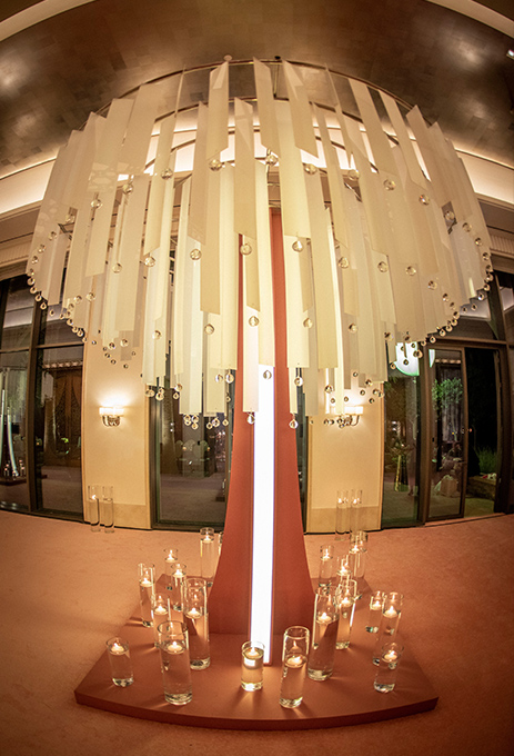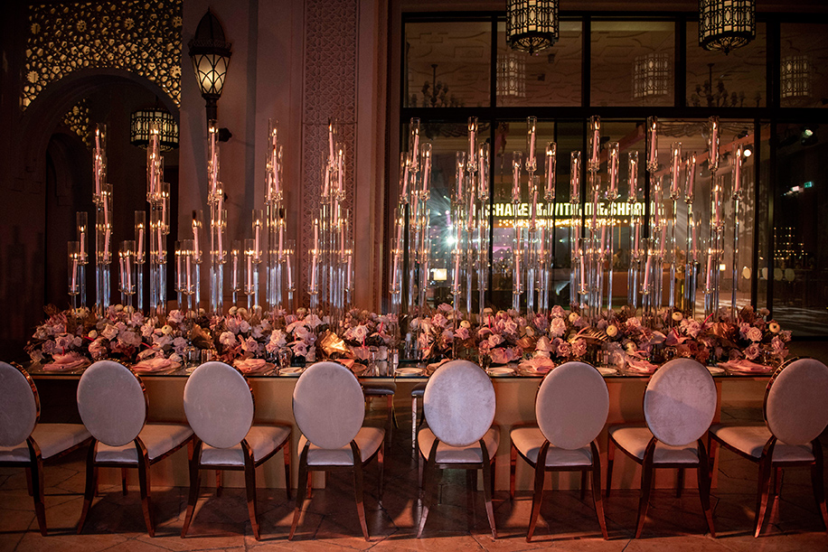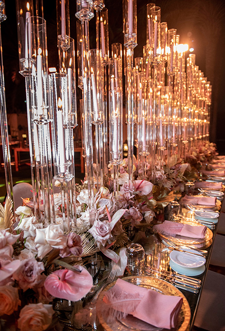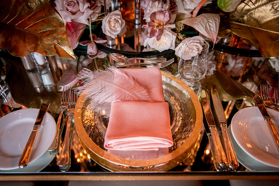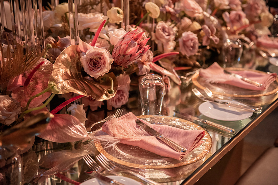 The seating arrangements incorporated striking floral arrangements, lots of green foliage, and gold-painted leaves running across the reflective table. Tall and slender glass candlebras with while candles were placed along the length of the table, which also had picture-perfect settings with silver cutlery, glass plates with gold rims, and pastel pink cloth napkins. Baby pink feathers tucked into the folded napkins was a charming touch.