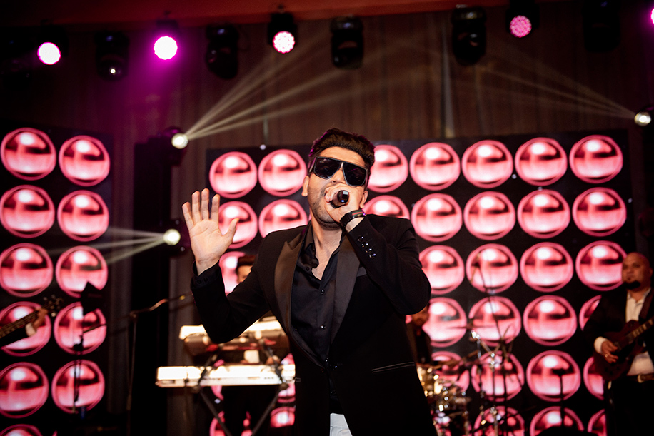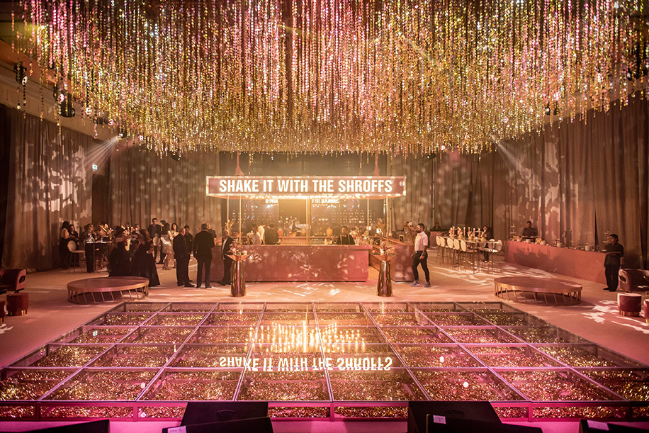 Blush drapes, carpets and curtains looked plush and elegant, and paired well with the V-shaped LED backdrop which led to the glass dance floor covered with golden streamers. Glittering chandeliers and fairy lights gave the whole venue a glamorous vibe.