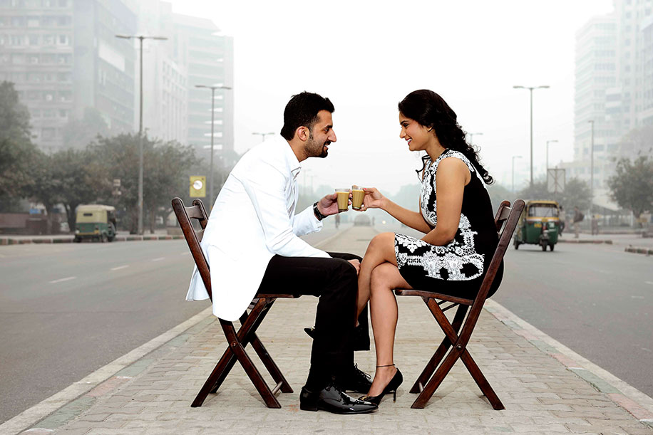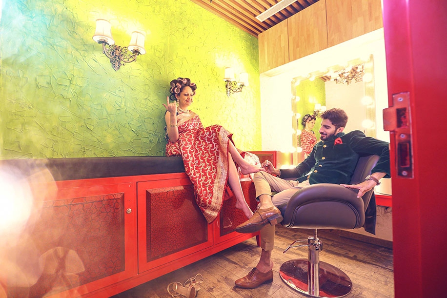 Tushi and Vaibhav share a long friendship and their unique camaraderie was what Noopur and Anish wanted to capture. Noopur explains, “We wanted to capture the simple moments of their relationship, like a ‘slice of life’ theme.” And so, the shoot features the couple in their pyjamas, trapped (happily!) in a box. In another picture, there is a calm evident between them, amidst the humdrum bustle of city life. Anish thinks it works perfectly, “I think we captured their true personalities, their easy rapport and friendship. It worked best for the shoot.”
