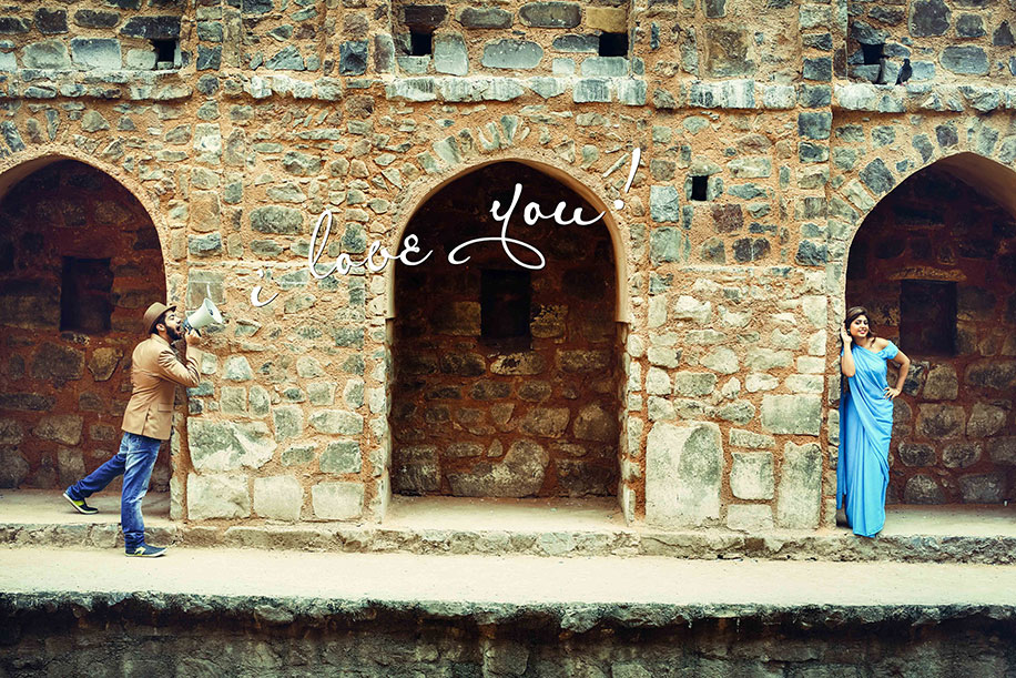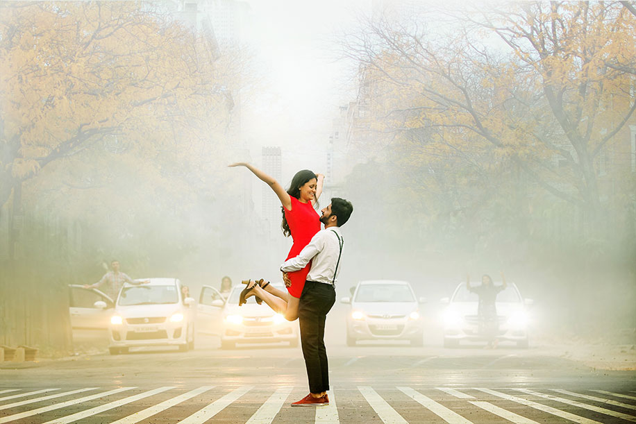 A pre-wedding photo shoot acts as a beautiful prelude to your impending wedding festivities. You’ll want romantic outdoor shots and soft focus captures but we suggest you up it a notch and bring a bright splash of quirk, distinction and personality to your pictures! Let Wedding Filmers Noopur and Anish of Happy Flashbacks inspire you with favorites from some of their ‘wackiest’ pre-wedding captures. Their style of weaving story in pre weddings is unique, real and super fun.