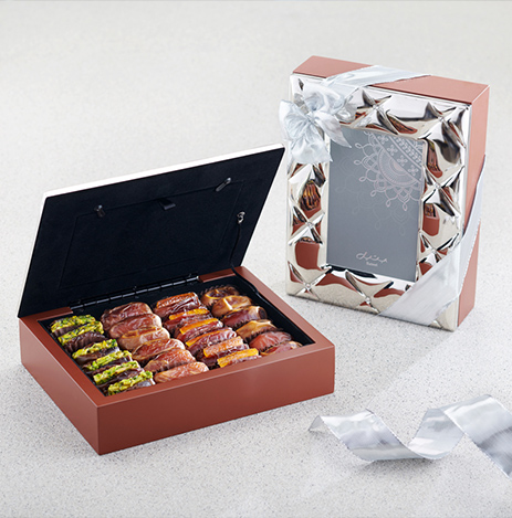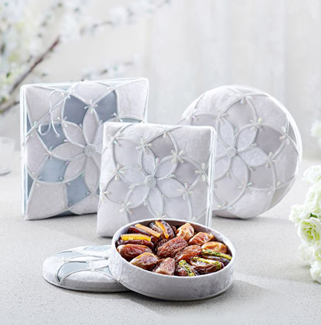 Adorned with a geometric floral design that is accentuated by a shimmering silver hue, the Sylvia Gift Set from Bateel is a masterpiece that leaves one spellbound. Opulently designed with conical pearls and sparkling lace, this gift box comes in two shapes, square and round, and opens up to reveal premium filled dates that treat the senses with each bite. And, in case the receiver of the box is more inclined towards the classics, one can also choose to fill the gift box with premium plain dates.