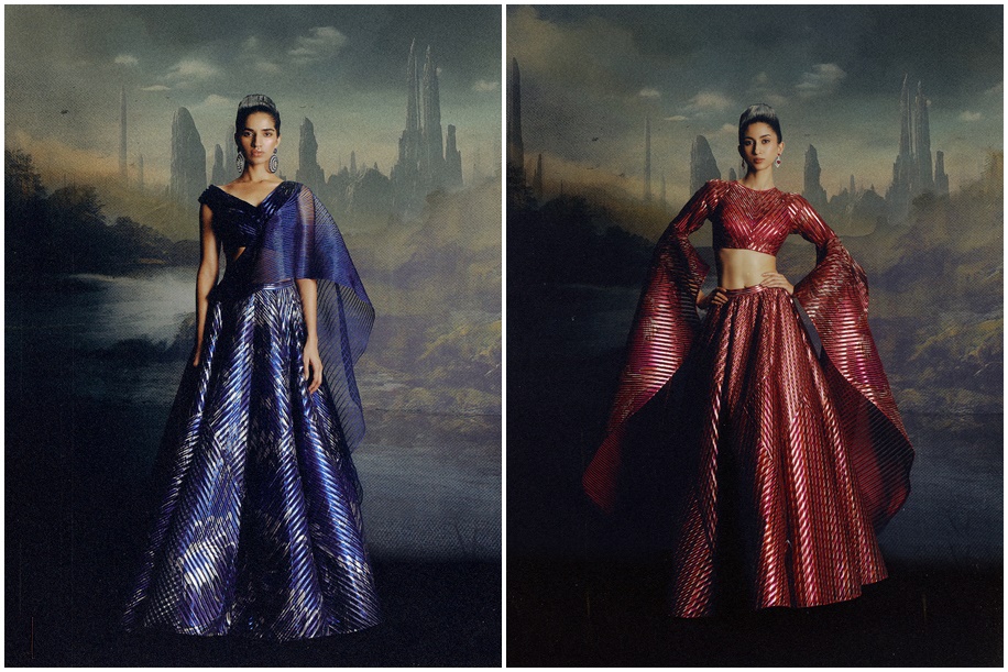 Get your modern fairytale moment in these bold metallic lehengas by Amit Aggarwal. The exaggerated silhouettes, geometric designs, and innovative fabrics come together in awe-inspiring ensembles that will leave your guests spellbound!
