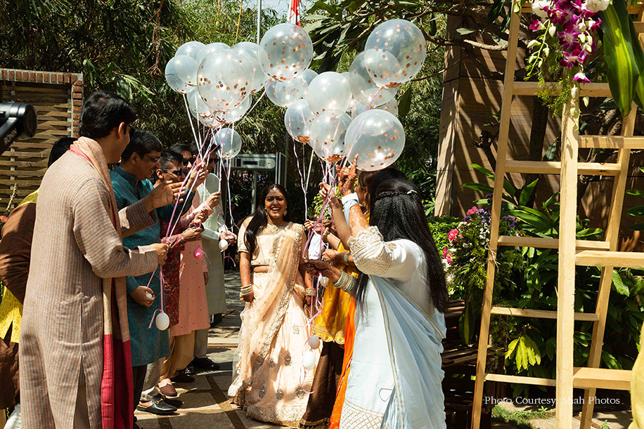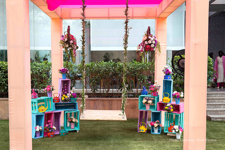 The day started early with a Bhaat ceremony initiated by the bride’s maternal family. It was aptly decorated with colorful elements such as swings, teapots, crates, and ladders. The bride made a jaw-dropping entry wearing her ancestral lehenga with silver work that was passed down by her great grandmother over generations. Her girl squad held glittering balloons to welcome her.