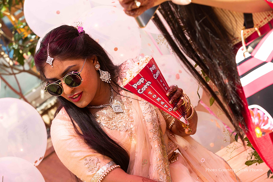 “Detailing and personalization is the most important thing I wanted at our wedding, and Bon Evento fit the bill as they are known for their efficient planning. Everything I had envisioned, from a particular theme to specific elements in decor like glitter balloons, popcorn cart or potato stall, they made it all happen. I would have a random idea, and the entire team would come up with creative solutions to execute it. Since I am not a big fan of flowers, they presented over 100 different ways to add drama and glamour in the decor. For my wedding outfits, Jay custom-made all of them at his Bridal wear store called JD designs.”, shares the bride.