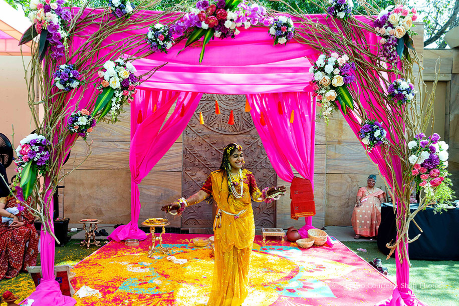 For the haldi function, as Sakshi was smeared by the traditional turmeric paste, she was showered with buckets full of water and tons of marigold petals by her family and friends.