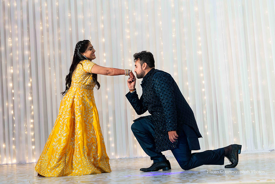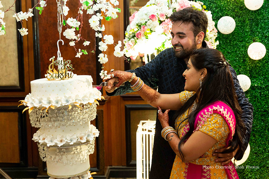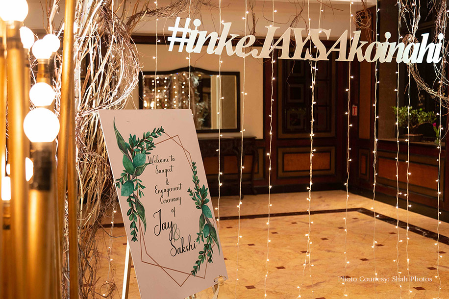 The Sangeet gala decorated with their wedding hashtag #inkeJAYSAkoinahi enticed the guests near the entranceway to take their cameras out and click pictures. After a stunning entrance where the couple entered with a flash mob and enthralling dance performances by their families on famous hit tracks, the couple exchanged rings and celebrated the evening by cutting a chandelier designed cake. Sakshi looked pretty in a yellow anarkali with a belt that spelled JD, which was designed and personalized by Jay. The groom, on the other hand, sported a blue jacket and kurta pajama set by Avega.
