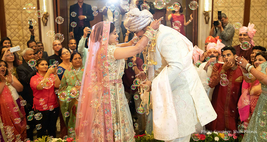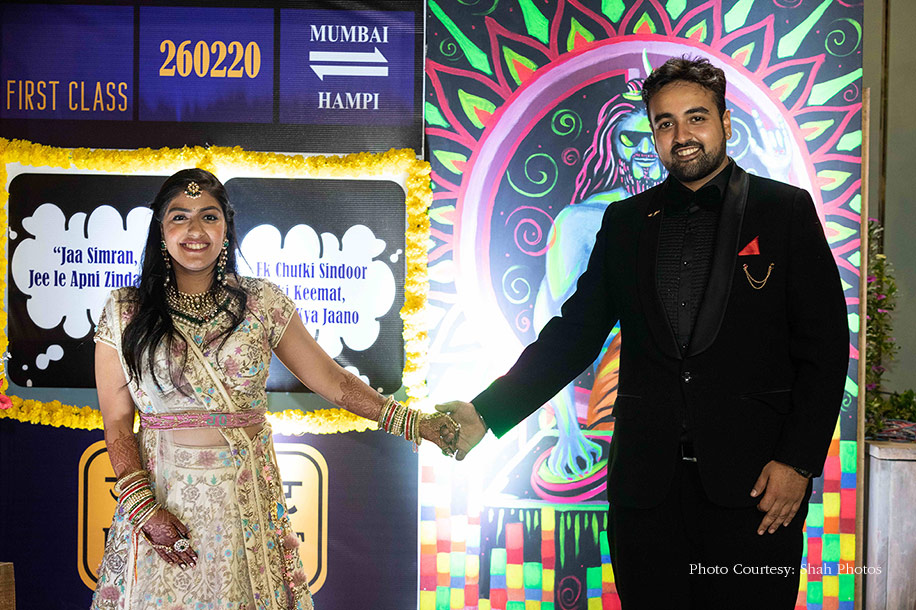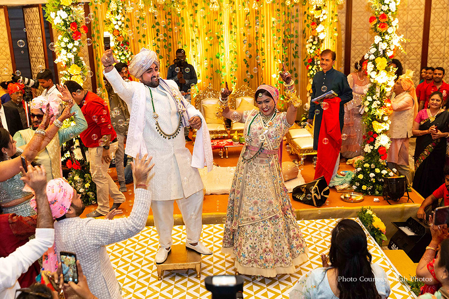However, the highlight was the split personality photobooth which expressed Sakshi’s persona with Bollywood elements on one side and Jay’s persona with Lord Shiva’s psychedelic musical elements on the other, creating a fun twist. As soon as the couple exchanged their varmalas, the Gayatri Mantra was played while the bubble machines blew bubbles into the air. Sakshi looked elegant in a beige and pink customized lehenga by JD designs, with a personalized belt that had the JD logo, their wedding name, and their nicknames embroidered on it. Jay looked dashing in a white sherwani with beaded work by Vig Sons.