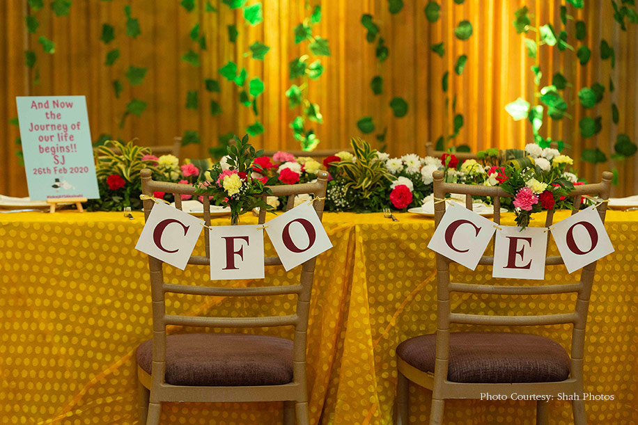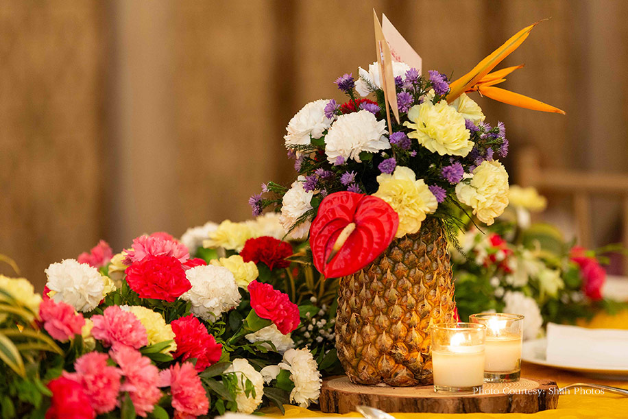 Their wedding was a vibrant affair, as it observed a rich yellow color palette owing to Jay’s love for pineapples and Sakshi’s fondness for potatoes. It was adorned with fresh pineapples and placards displaying funny anecdotes for their tabletops. With a live potato corner serving fries, mashed potatoes, wedges, potato shots, the guests eagerly made their way to the stall.