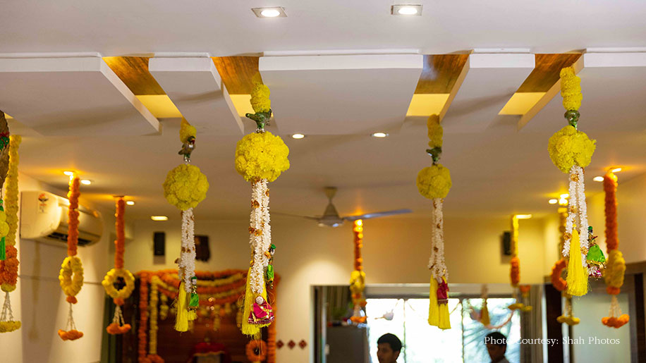 The venue was decorated in green and yellow hues, birds, flowers, and the highlight was the couple’s miniature dolls which added a personal touch to this private function. Held at the bride’s residence, this Marwari function saw all the married ladies in the house acquaint the new bride-to-be with her daily responsibilities at her new home.