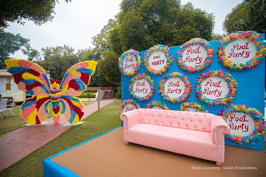 Soft tones with white, purple and yellow flowers cast a spell of tropical paradise for “Carnival’ themed pool party. Entertainers dressed in pastel shades, with floral tiaras and garlands gave a Hawaiian feel to the function. An electric blue door laden with fresh blossoms and potted plants on either side was a scenic spot for photos. However, the highlight of the venue was the photobooth with candy pink sofa in the middle and a colourful backdrop decorated with umbrella-shaped cocktail stirrers covering several floating rings. On one side of the photo booth was a giant butterfly smothered with flower petals.