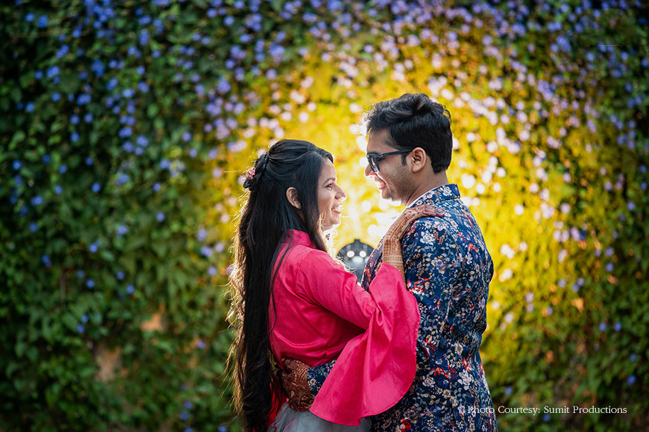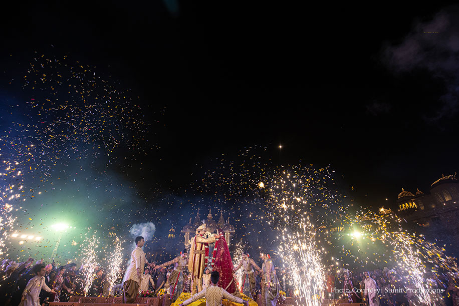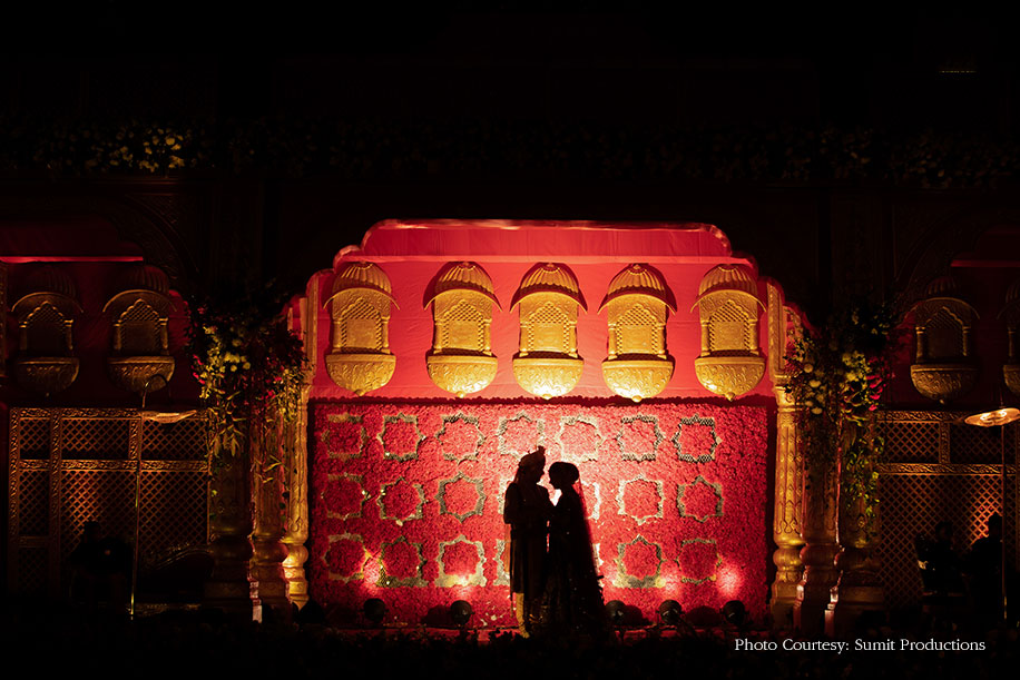 Their wedding saw all hues of red and gold that exuded royalty and exuberance. Neha picked a red lehenga which matched the profusion of red roses and petals that were the main decor element. Matching the groom’s gold sherwani was the golden mandap and the dazzling pyro fireworks.