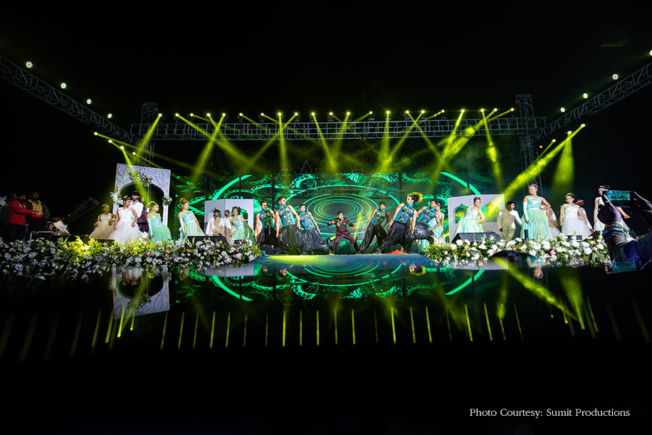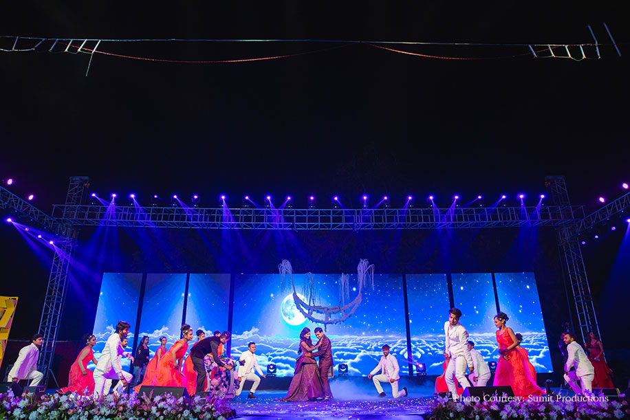 The evergreen Bollywood-themed sangeet night saw the stage lit up with glowing projection screens, spotlights and wildflowers. The groom made a stunning entry on a metallic structure that read his name, Sangam, which dropped down slowly from the top of the stage. The bride also glided down from an arched white structure with stairs.