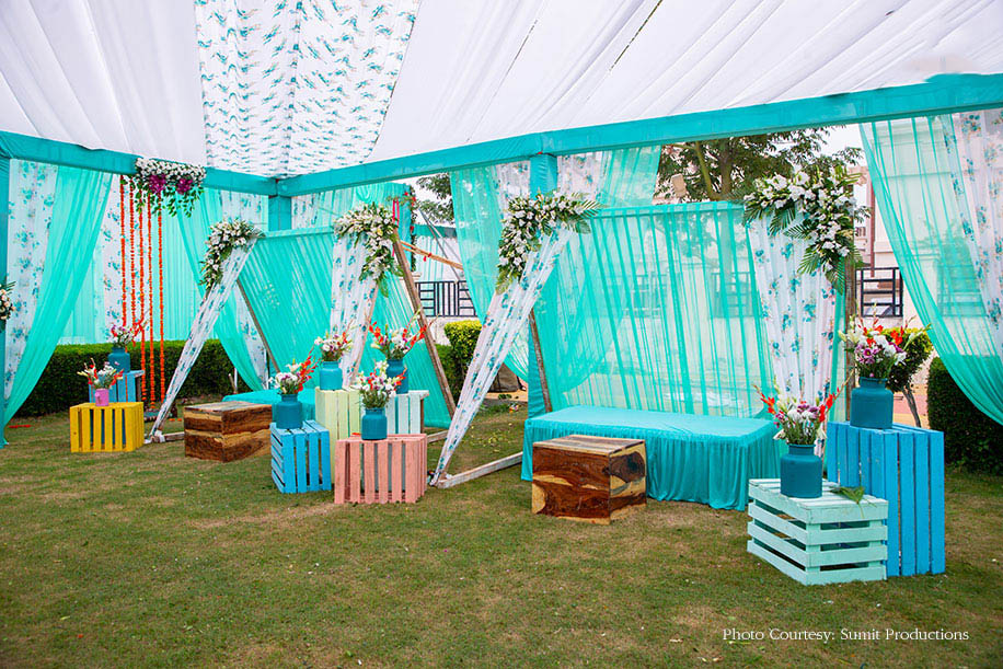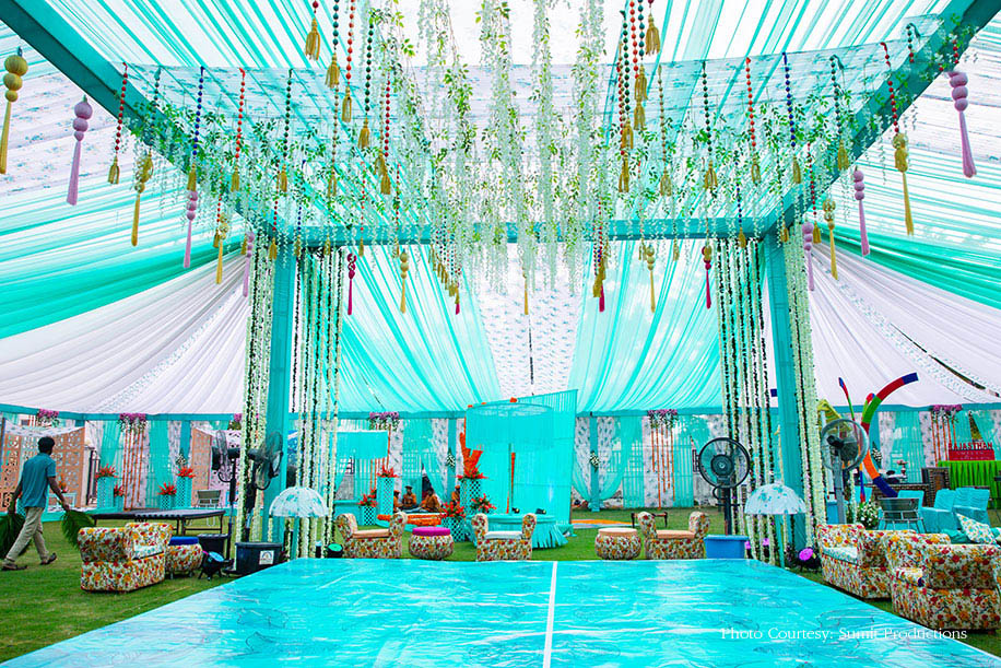 For the mehndi, the couple picked a soothing blue shade for the decor palette. Complementing the azure drapes, carpet, and cabana seating were contrasting orange gladiolus and marigold blooms festooned across a wooden structure to resemble a tree. Wood frames, tassels, and bells created a vibrant canopy hanging across the overhead drapes, and metallic ferns on either side of the entrance exuded elegance.