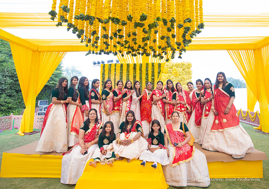 The haldi was a simple, sunny affair with yellow drapes, marigolds and roses with lots of greens. Guests showered the soon-to-wed couple with yellow petals to welcome them to the haldi ceremony.