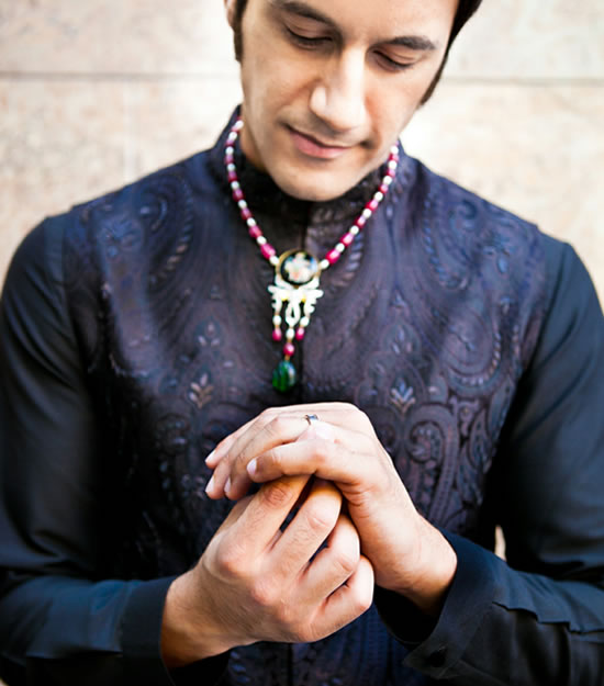 Our gorgeous groom from all “All the Groom’s Men” fashion spread got a lot of love from our readers. For those of you who wanted to know more about the jewellery, Danny Sura is wearing a necklace inspired by Indian mythology from Popley La Classique. It is handcrafted in gold & diamonds with painted Krishna motifs on onyx gemstones strung with pearls & rubies. It is a part of Rhea Nasta designer jewels wherein 1 design is made in only 1 piece, never repeated.