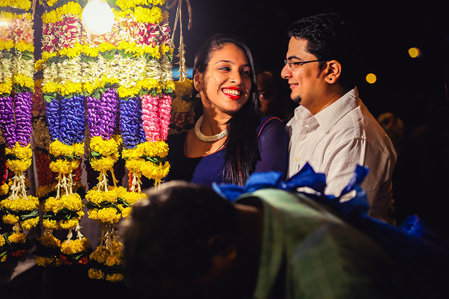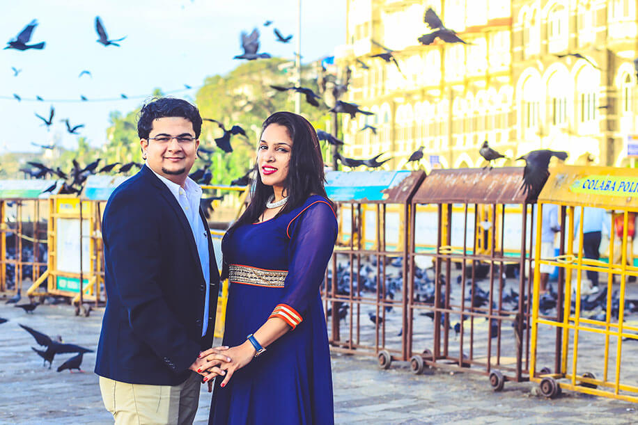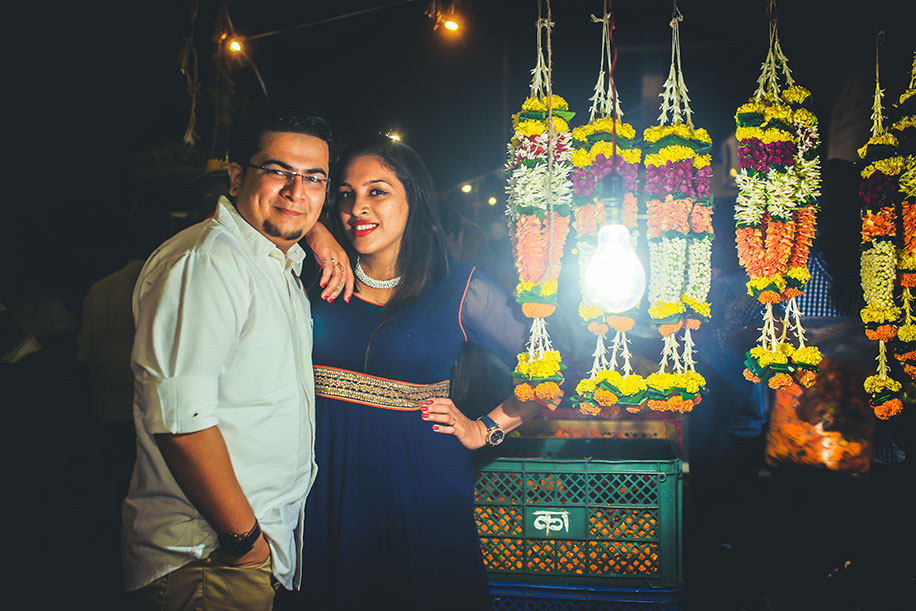 Harshada and Amey’s pre-wedding shoot took place at various locations in Mumbai such as Dadar Flower Market, the Gateway of India, Asiatic Library, Sagar Upvan and Kala Ghoda. This collection of landmarks was a nice mix of arty and iconic sites in the city that never sleeps.