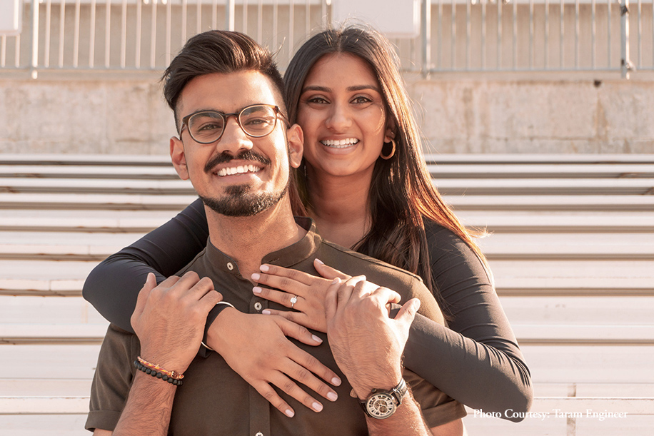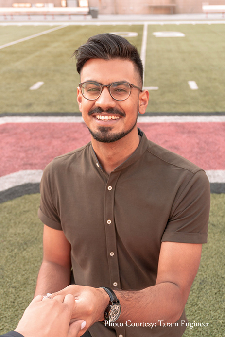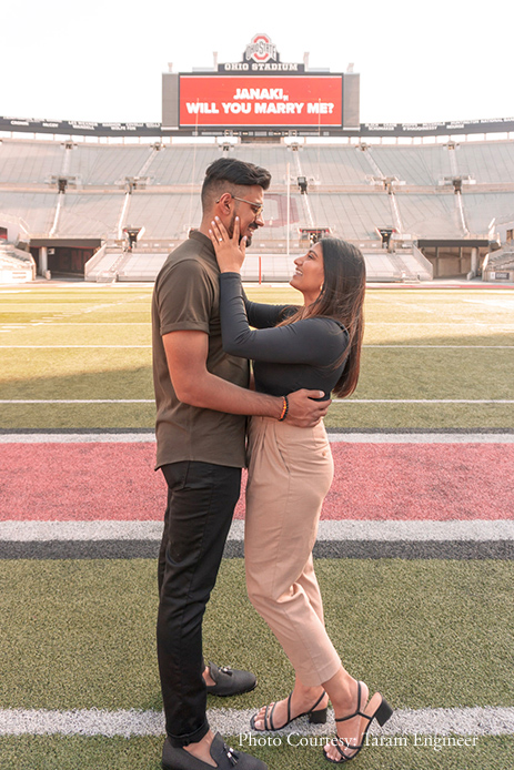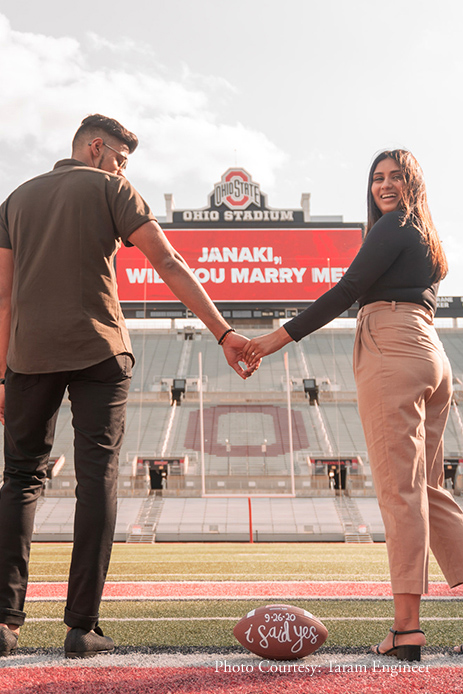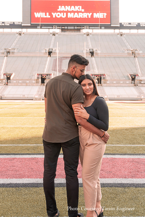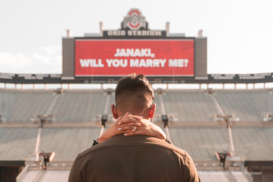 The bride shares, “To maintain the secret, while still keen to know my choices, Raag cleverly told me two weeks before that one of our best friends was popping the question to his girlfriend, who’s my best friend. I was super excited and launched into planning mode, with no idea that I was helping plan my own proposal. Even the rest of our group was in on the surprise, carrying on the charade on our WhatsApp groups. The day came and we headed to the Ohio State Stadium. Our friend, who was supposedly proposing, had asked all the friends to enter through different gates. As we entered through tunnel one, we were guided by a staff member about where to hide. Raag however cut through the field and stopping at the 50 yard line, got down on one knee and pointed at the jumbotron, which flashed “Janaki, will you marry me?” I was blown away and shouted yes with happiness. I knew by then all my friends would be hiding nearby, and shouted for them to come out. Due to COVID restrictions, only 10 people were allowed onto the field. After we took pictures, as we walked out of the stadium I saw all my friends and family standing outside screaming! It was truly the proposal of a lifetime.