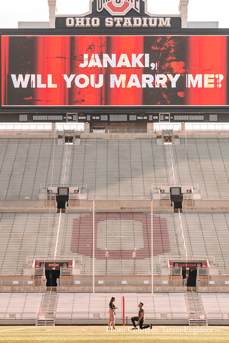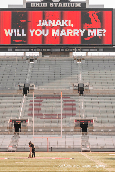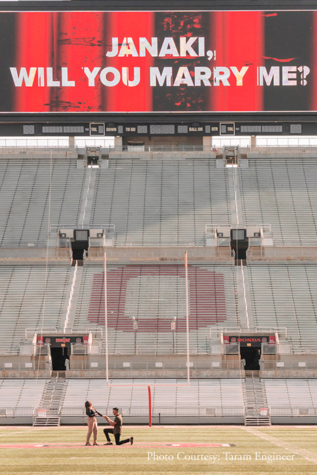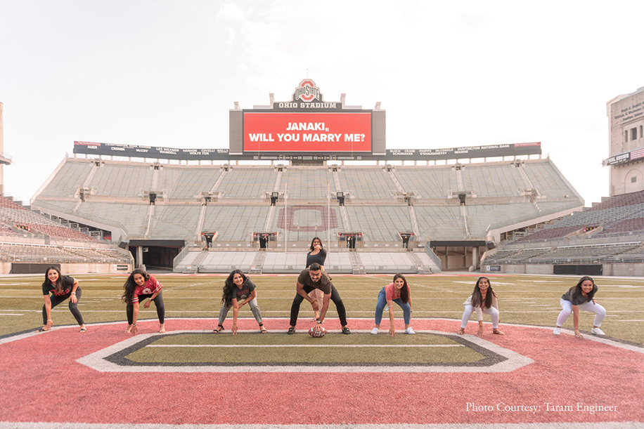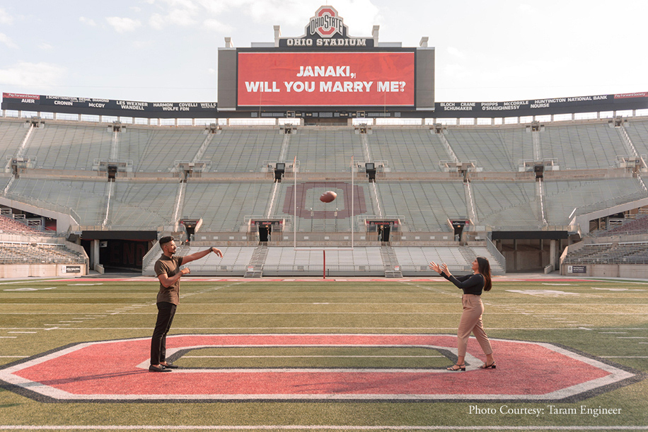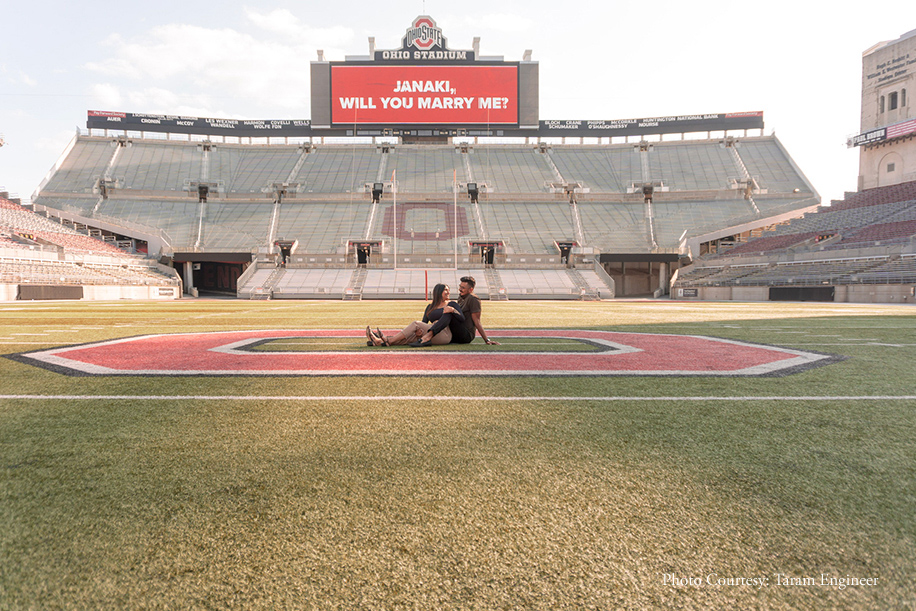 Nothing says soulmate like finding the perfect partner to share your cheers at every game of your favorite team! Bonding over their shared fandom of Ohio State Football, Janaki and Raag found their game-buddy for life in each other, and Raag’s unique proposal to Janaki was a celebration of that love. Here are a few glimpses of their special story.