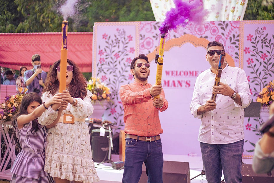 The guests arrived to a vibrant welcome lunch held outdoors. The minimal yet pretty decor of flowers and drapes in a pink palette softly lit up the lush green expanse of the beautifully manicured Palace Lawns that were replete with sculptural fountains. Floral motifs inspired by Palatial carvings and traditional carpets tied into the decor. Accompanied by a light casual lunch, champagne and beer, the guests had a gala time playing phoolon ki holi with an abundance of marigold petals.
