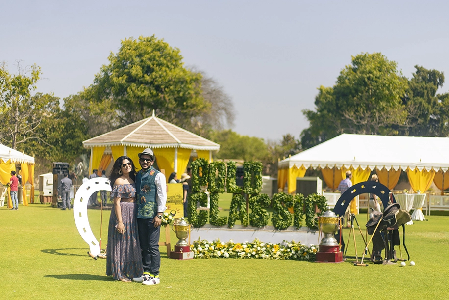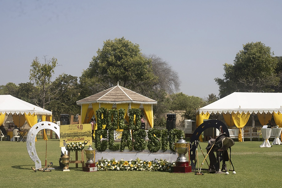 The final day saw a fun-filled Polo brunch to top off the celebrations. The function included a live polo match complete with spectator tents for the guests. The lively yellow and white decor included themed elements such as polo balls, mallets, trophies, horseshoes and more. A backdrop of polo jockey silhouettes flanking a trophy case made for a fun photo corner.