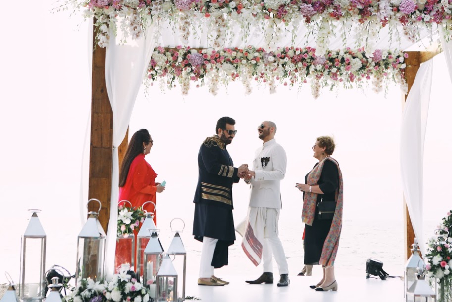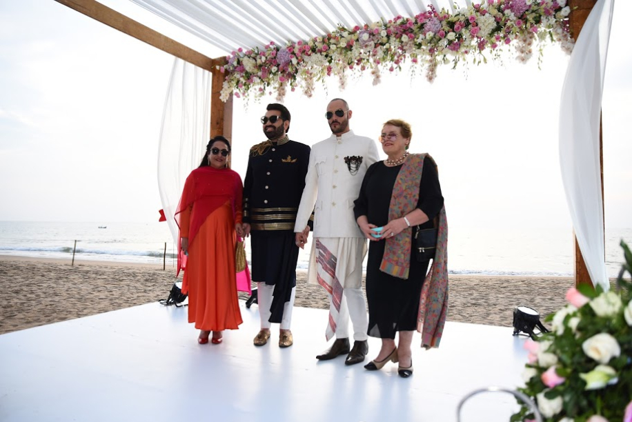 “With the reading down of Section 377, we just had to celebrate our union with immediate family and close friends here in India,” Keshav explains. “So, we decided to host another three-day wedding affair in Goa, and the celebration turned out better than my imagination! Shruti and her team from, VLW Global meticulously worked to bring out unrivaled color themes and design elements. After Paris, we exchanged vows here, this time against the breath-taking backdrop of a setting sun. Our respective sisters walked us down the aisle, to reach the stunning beach setting where our mothers stood to facilitate the vows. We also had a transgender high priestess officiate the ceremony.”