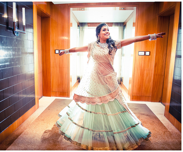 – Look through WeddingSutra (or http://arjunkarthaphotography.com) to see how real brides and models pose in wedding wear– try replicating those looks in front of a mirror. Don’t worry if you feel ‘goofy’ doing it– the effort is worth it.