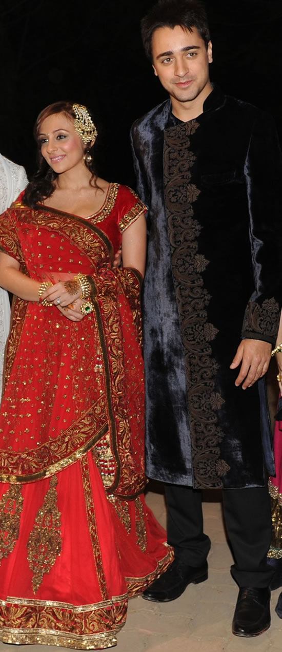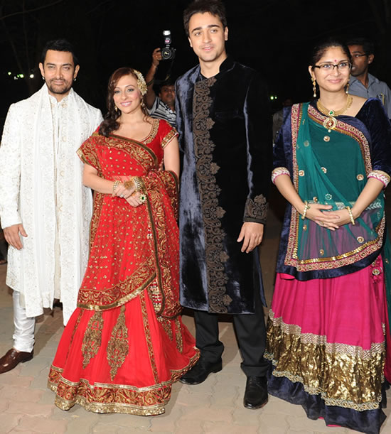 Hear the sound of millions of hearts breaking- the most eligible bachelor of Bollywood, the oh-so-gorgeous Imran Khan gets one step closer to being hitched. His Mehndi-Sangeet ceremony was held at Avantika’s family farmhouse in Karjat with many from Bollywood in attendance. Avantika looked ravishing in a red lehenga by Manish Malhotra and the dashing Imran wore a blue sherwani by Karan Johar-Varun Bahl. Aamir also chose a Karan Johar-Varun Bahl sherwani and Kiran wore a lehenga from her favorite designer Sabyasachi. Mumbai’s most popular celebrity Mehndi artist Usha Shah decorated the bride and her guests hands.