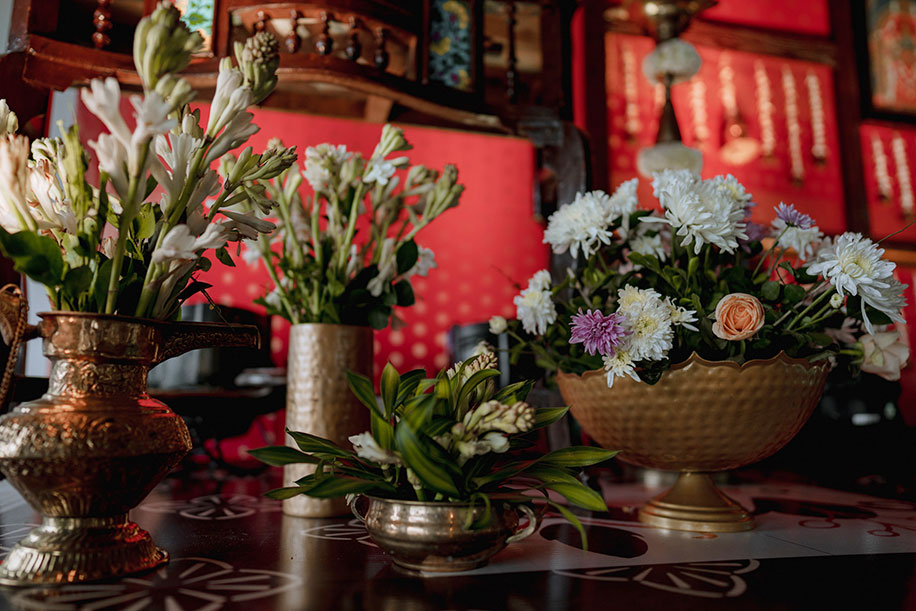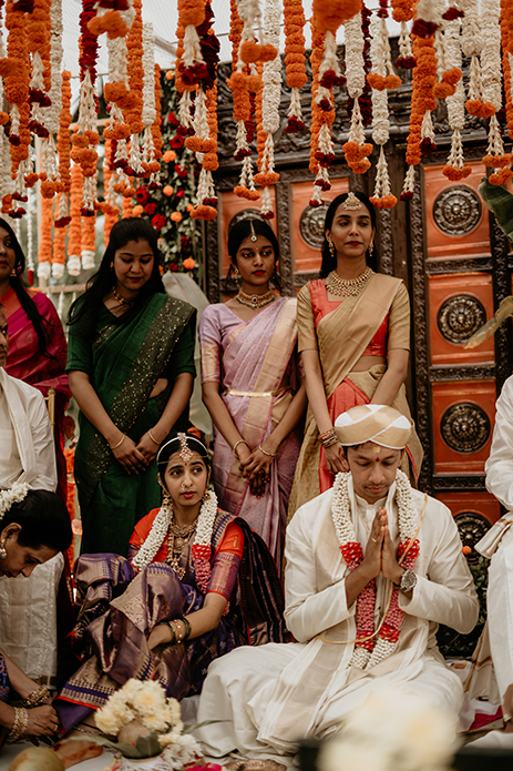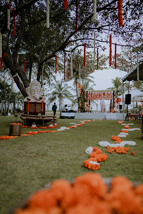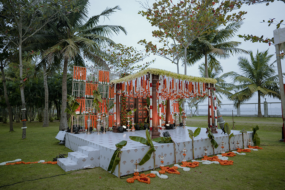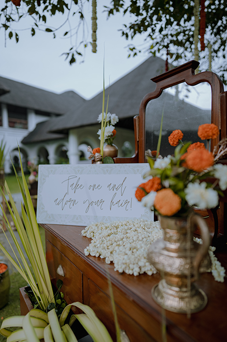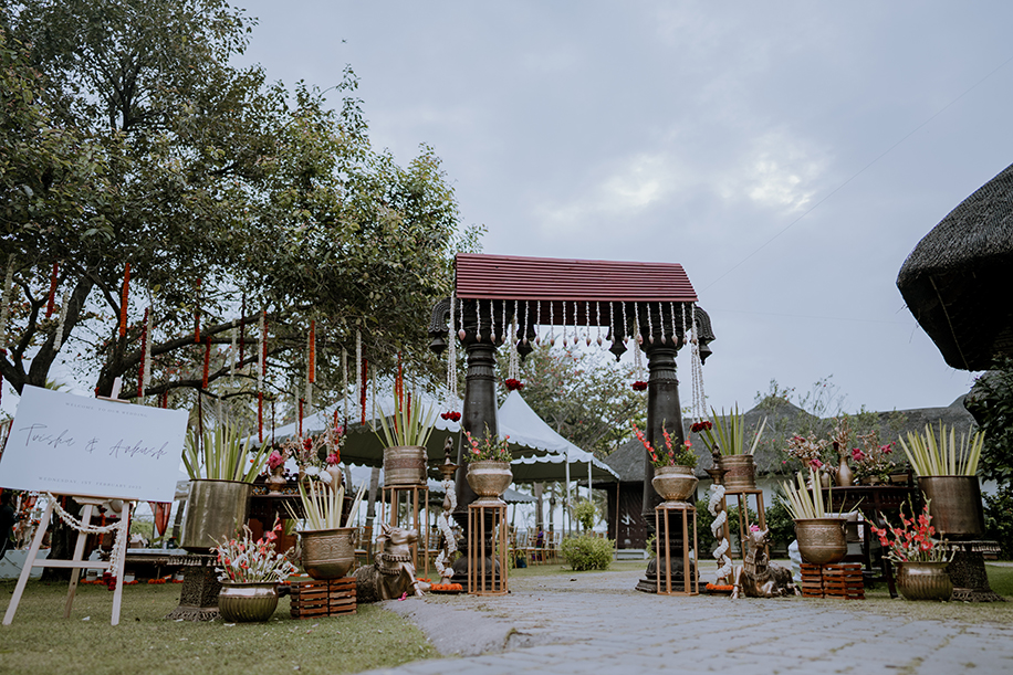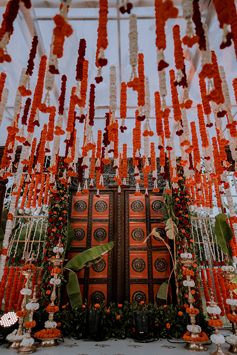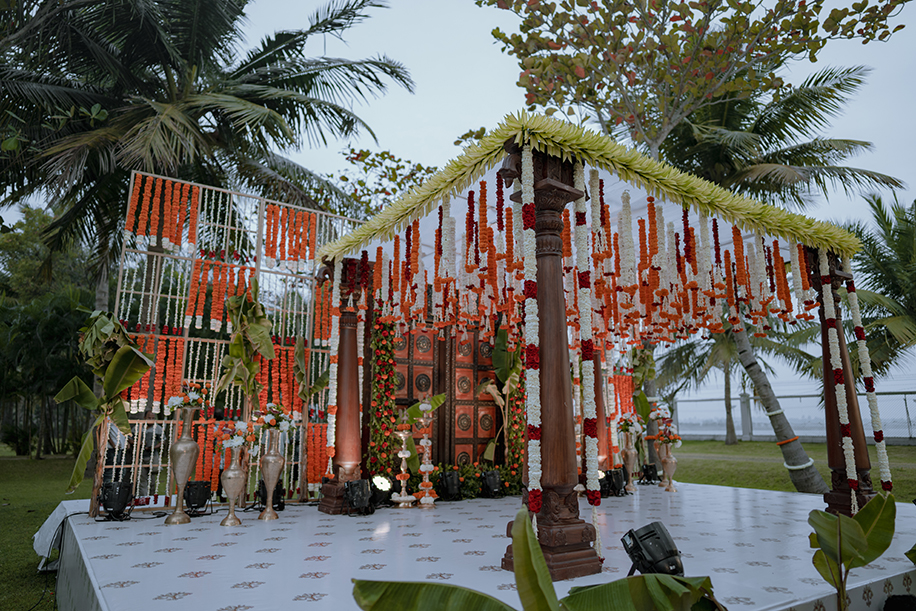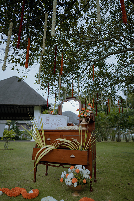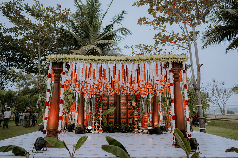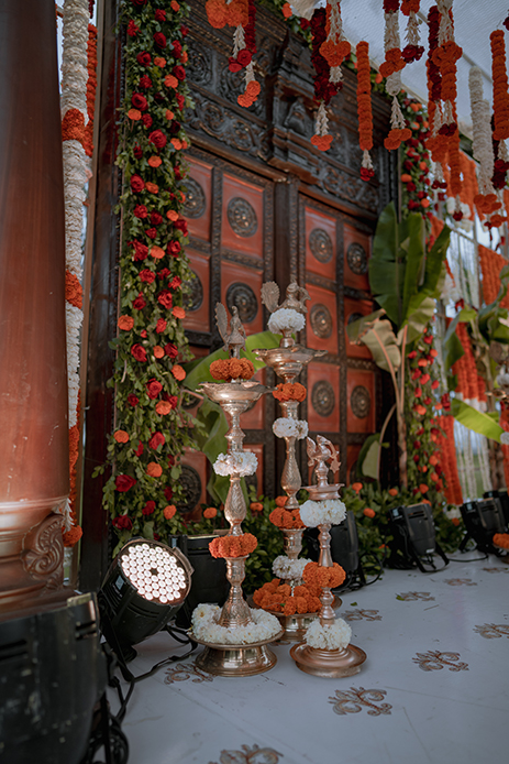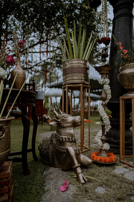 Charannya shares, “Our favourite of all, the wedding was an outdoor event. The colour scheme reflected the hues of the sunset with earthy tones used as maximal accents. The entrance featured Chettinad pillars with elegant brass props. The statement piece of the entrance however had to be the brass nandi. The walkway had marigold rangolis and the tree had floral garlands to add to its beauty. The partially see-through mandap with a Chettinad door in the middle with a garland shower on its ceiling was a sight to behold. The see-through panels on the sides were a mix of orange and white flowers with bell hangings. The central part of the mandap also featured a lot of props that suit the wedding mood like kuthuvilakku wrapped up in marigolds, banana plants etc. Apart from these statement elements, cute little corners which were planned and improvised on the spot were the show-stealers like the antique chest of drawers with floral embellishments with a cute little sign to serve the guest with flowers for the wedding was functional but also aesthetic and made for a cute photo-op as well.”