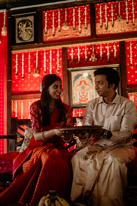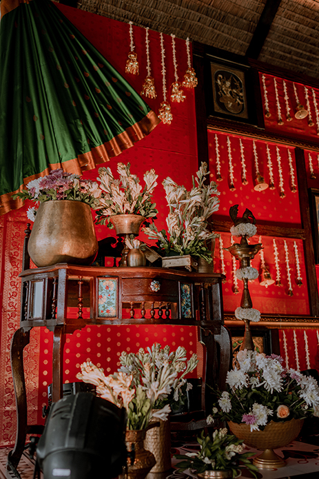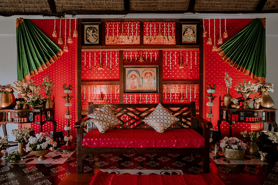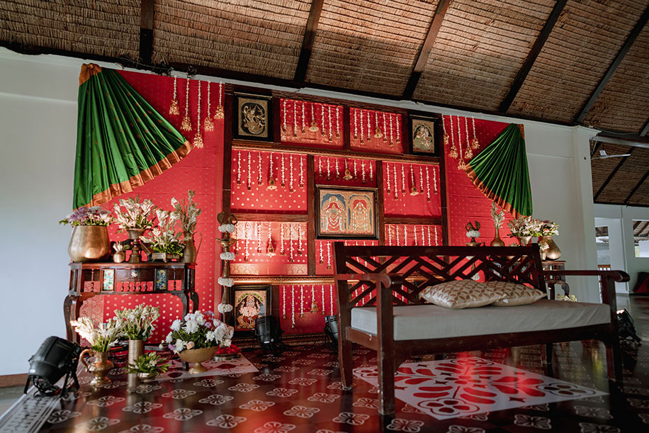 Charannya shares, “We curated a unique theme and backdrop for the event of varapooja inspired by the Chola charm. The backdrop was an amalgamation of all things Tanjore like brass antiques, Konrad silks, intricate wooden frames, and the amazing Tanjore paintings. It felt like a modern revival of cherished heritage. For the props on the stage, we added kuthuvilakku, an antique wooden table with some brass props to add to the beauty and elegance. The colour scheme chosen was reddish pink as the dominant with green as the recessive and gold and white as the accents to truly bring out the essence of the Cholas and Tanjore.”