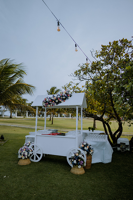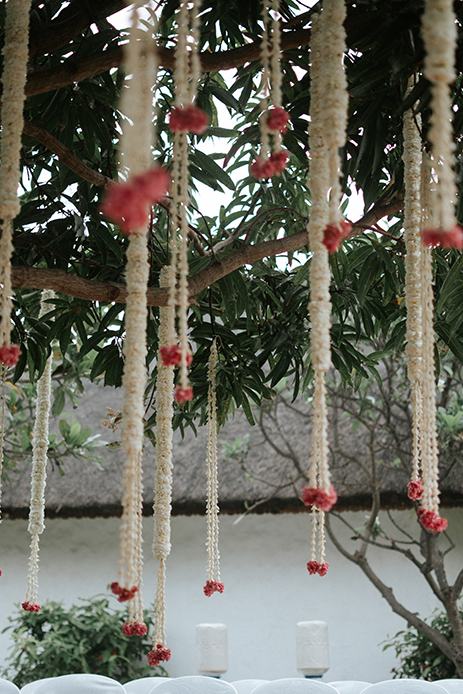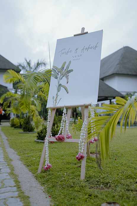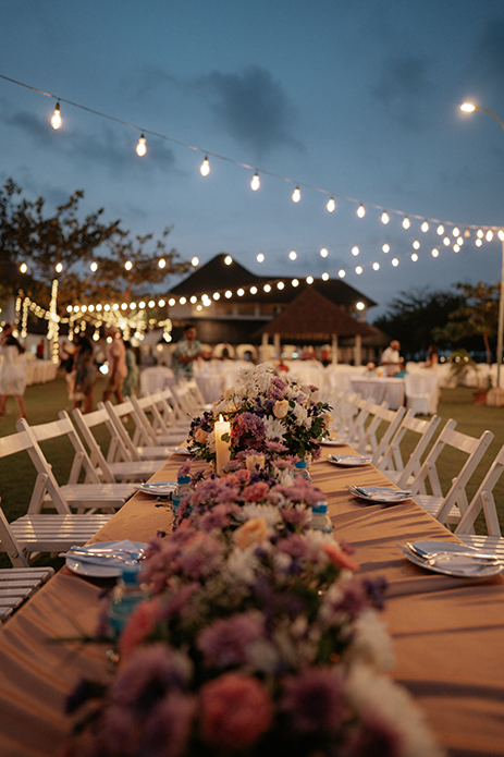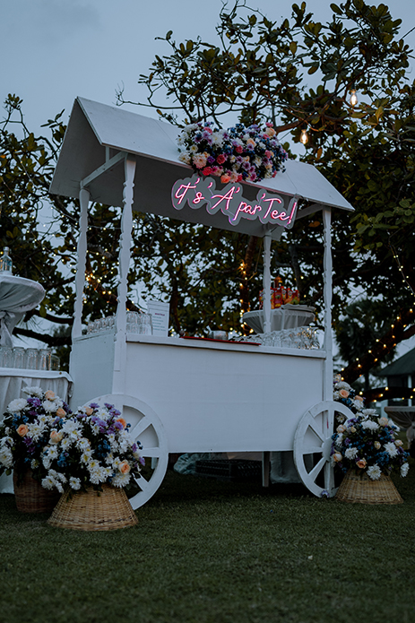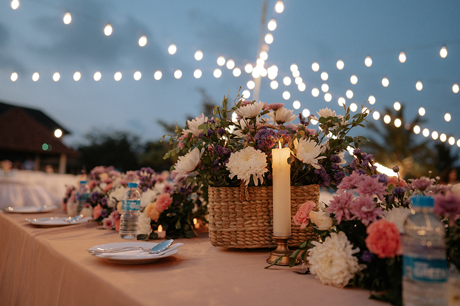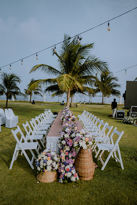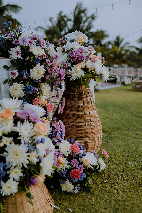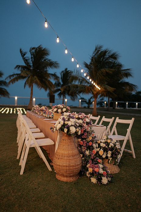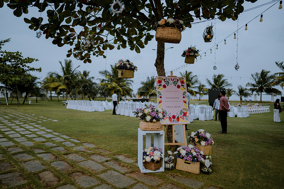 Charannya Seetharaman from The Wedding Experience shares, “A relaxing and cozy ambience is what we went for with the sundowner and that was achieved with pink, blue, and purple florals. White furniture, string lights, and finally, some wicker baskets added character and a rustic touch to the whole ambience. The event was about bringing people together to sit down and enjoy. Therefore, the long tables were preferred with the table runner consisting of gorgeous flowers and candles to keep the setting very pleasing. The trees were utilized to hang props and unify the look and theme.”