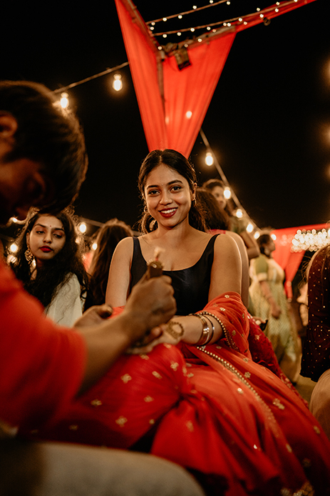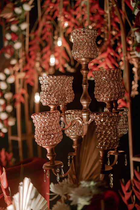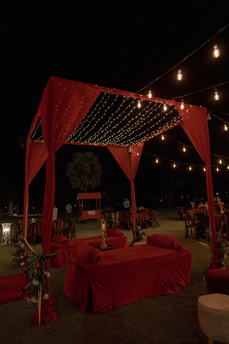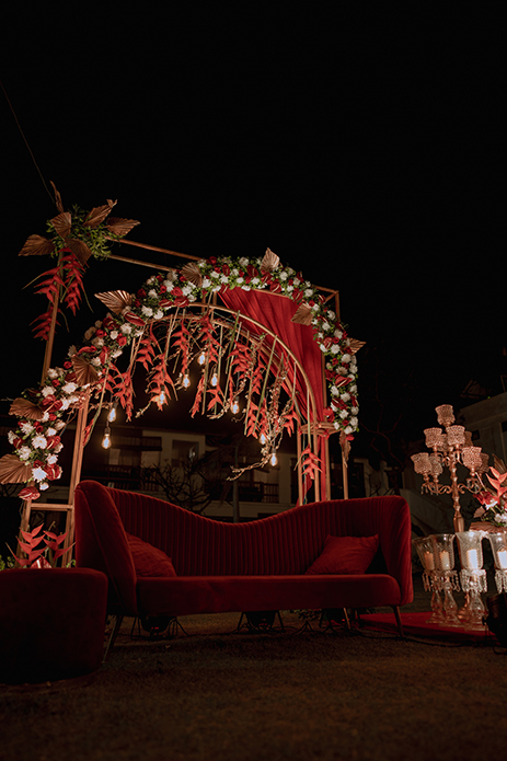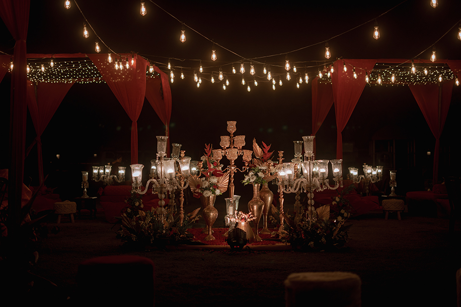 Swathed in deep scarlet hues and decorated with tropical banana flowers, the mehndi looked dreamy under the starlit sky. With rustic arches, vintage bulbs and candelabras the setup resembled a luxurious enchanted garden.