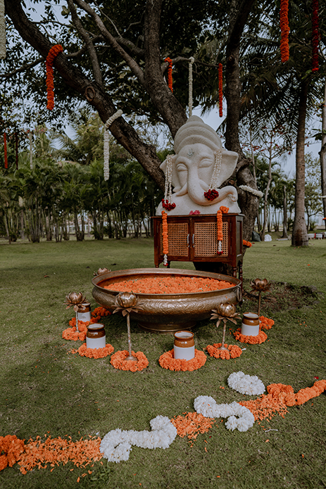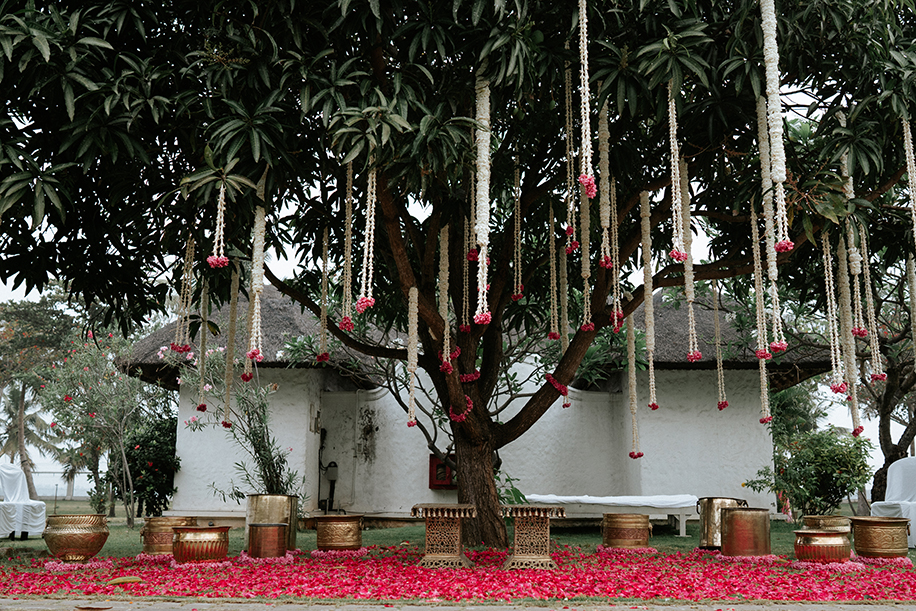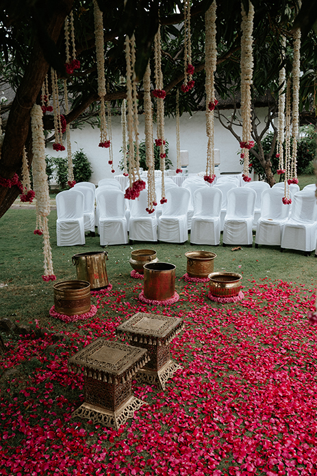Charannya shares “When we first laid our eyes on the magnificent tree, we knew it had to be the focal point for our haldi. Being a day event on the lawn, the colour scheme had to enhance the existing ambience which is why we picked pink and white with gold accents which worked well with green. The tree was decked up with garlands of white flowers along with pink flower bunches at the bottom at varying heights. The grass beneath the tree was covered in a sea of rose petals to highlight the event area and add a nice pop of colour to the photos as well. The luxe element of gold was brought through the use of brass props like urlis and other vessels along with the seating for the bride and groom.”
