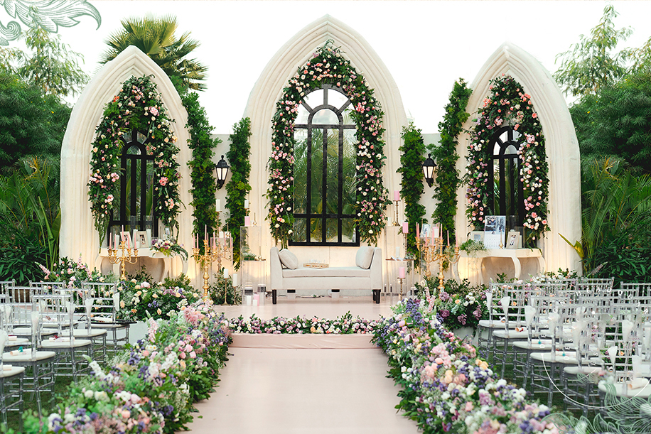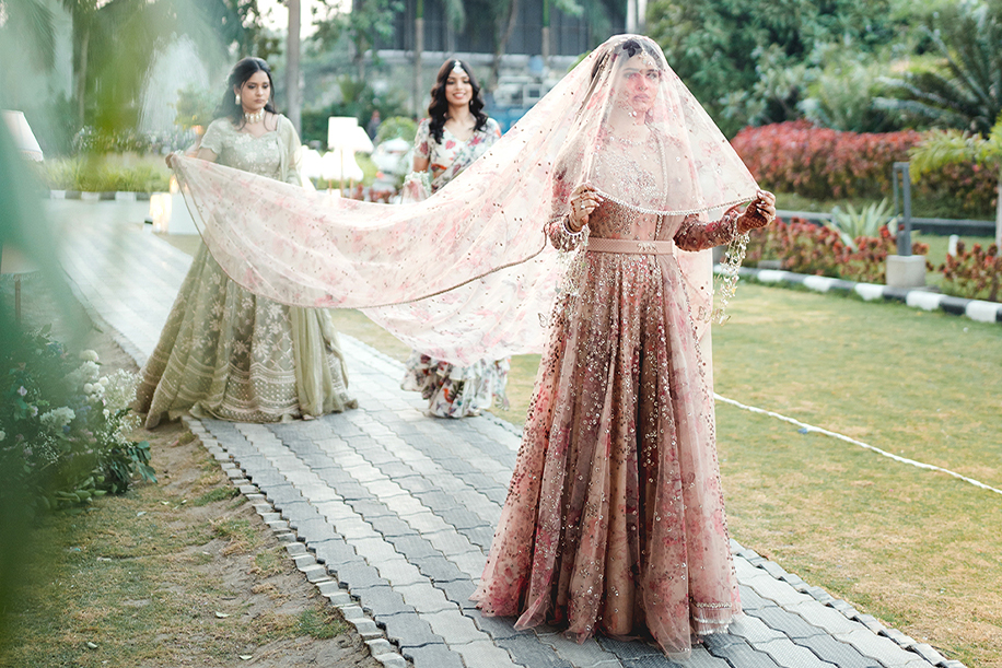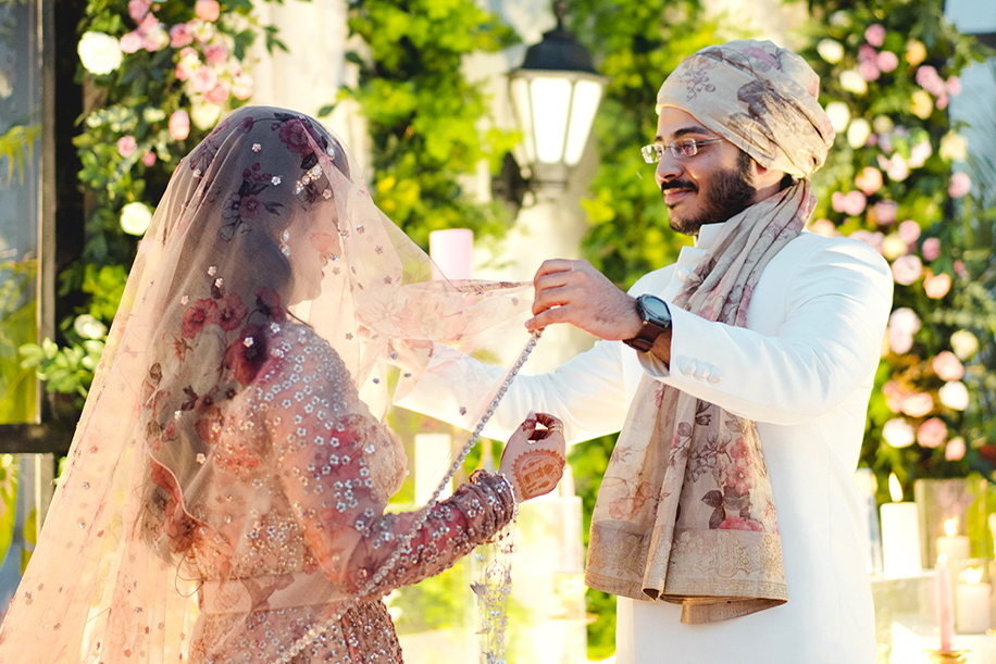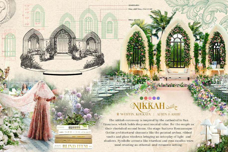 Nestled amid the lush lawns of The Westin Kolkata Rajarhat, the Nikkah took place in an ethereal romantic setting decked with blooms and foliage. The decor was inspired by a Cathedral in San Francisco where the couple currently resides, and held deep sentimental value. The circular nuptial stage featured 16th-century Romanesque-Gothic architectural elements such as pointed arches, ribbed vaults, and glass windows that allowed the light to seep in to create a warm ambiance at the altar, like the comfort of being in your living room. Symbolic Islamic elements like brass “itardaani”, as well as rose candles, flowers, and more added to the charm of the occasion.