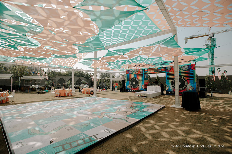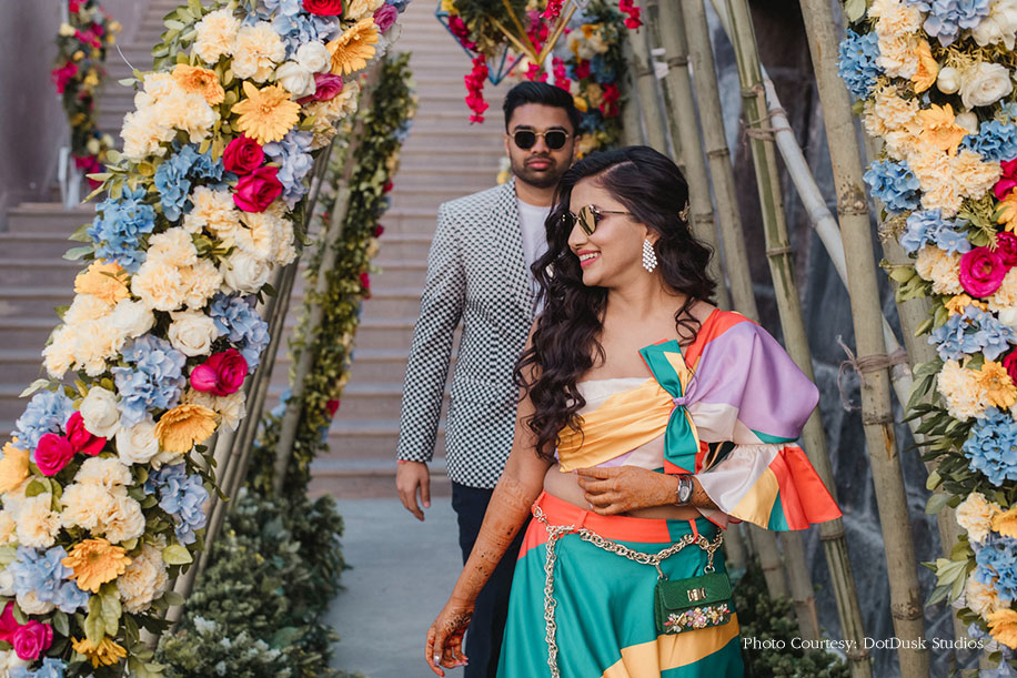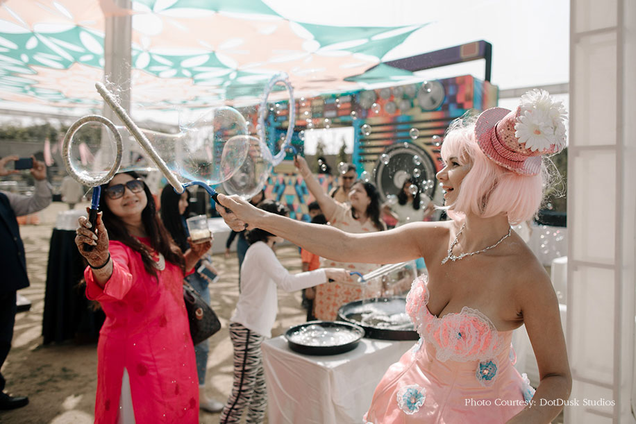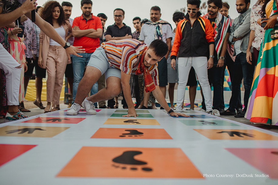 Kickstarting the celebrations in style, the duo hosted a joyful high tea by the pool where guests, wearing vibrant geometric printed attires, mingled with each other. Making sure that everyone felt at ease was anchor Jay Karmani who shared witty anecdotes to keep the guests entertained. Adding his musical prowess into the mix was DJ Shadow who played peppy beats that got everyone grooving. However, the highlight of the occasion was the couple’s entry that was heralded by their squads of friends in a fun manner.