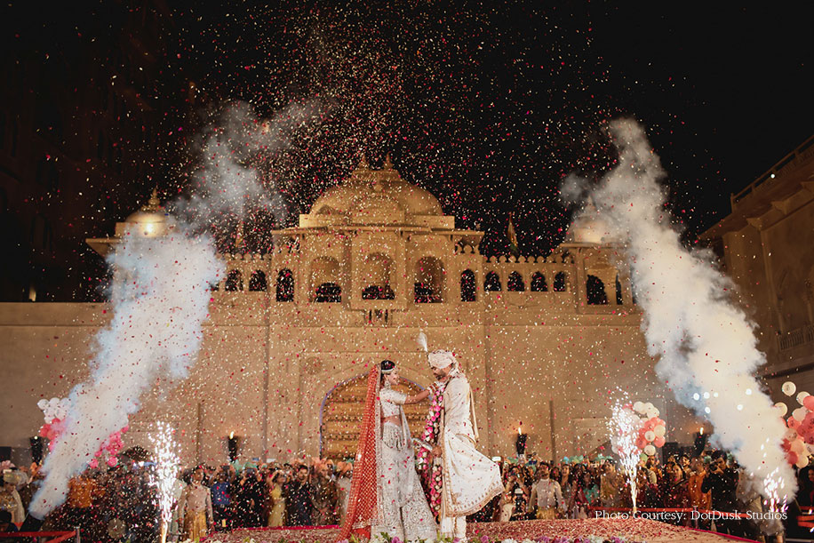 For the big day, the groom made a grand entrance on a vintage car with a baarat that consisted of elephants, horses, darbans, and a DJ van. And, as the garlanding ceremony took place on the porch of Hotel Fairmont, the 400-year-old doors of the palatial structure swung open to reveal the bride and groom who were greeted by family members who tossed balloons in the air to celebrate the occasion.