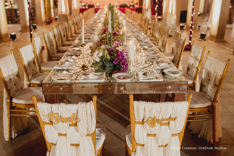 Keeping the venue in mind which was a vast open terrace under the starry sky, the rehearsal dinner was a glamorous affair with guests turning up in tuxedos and gowns. Elements like fortune cookies, a customized champagne wall, and a smashing entry by the couple impressed all. Punctuated by heartfelt speeches by Disha and Jay’s loved ones, a light-hearted roast session and the mesmerizing tunes of an acoustic singer, this function was high on style and sentiments.
