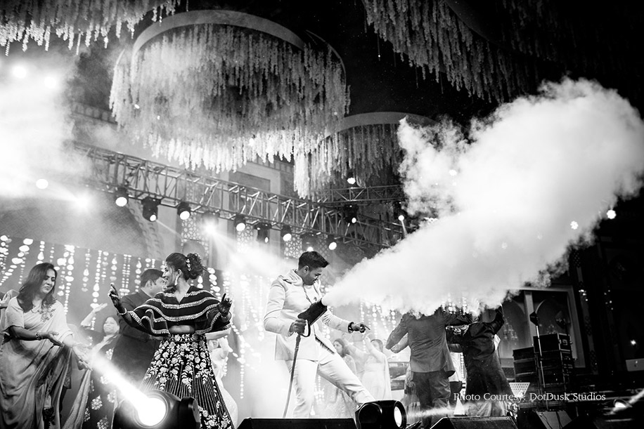 Hosted at the plush VYOM, the sangeet was a dazzling affair that fused contemporary and traditional elements together to create an atmosphere that set the right party mood. With trippy special effects encouraging everyone to set the dance floor on fire, the evening included stunning performances executed by family members and friends. Adding their groovy tunes into the mix were Nakash Aziz and his band, along with DJ Shadow, who ensured that everyone celebrated till the early hours of the night.