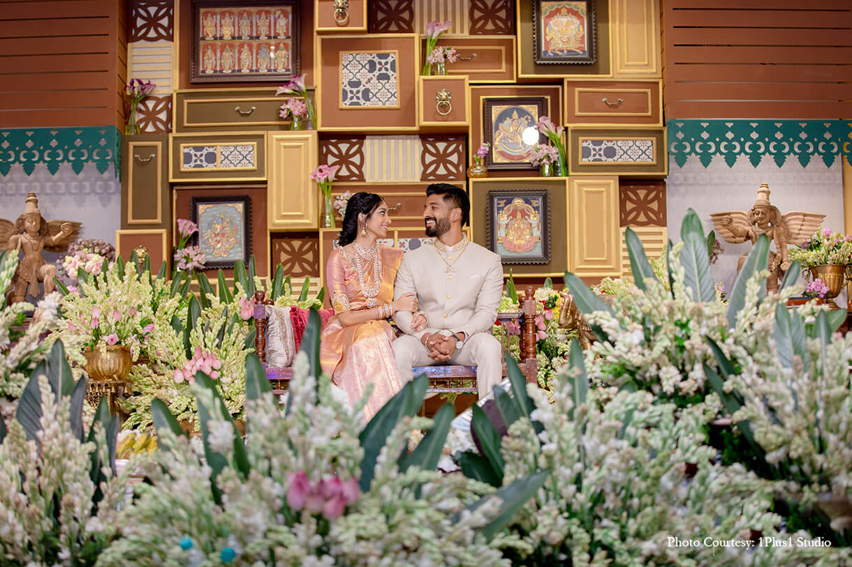 The union of art and luxury is a rare occasion. But, when done right, this union can easily trump the usual glamour that one sees at Indian weddings. At Nithila and Keerthen’s engagement ceremony, something similar took place as cues were taken from the rich Chettinad culture and the stunning Tanjore art forms to create an event that stood out. Designed and conceptualized by WeddingSutra Favorite – The A-Cube Project, the celebrations were an ode to the couple’s cultural roots while seamlessly infusing the duo’s love for modern aesthetics.
