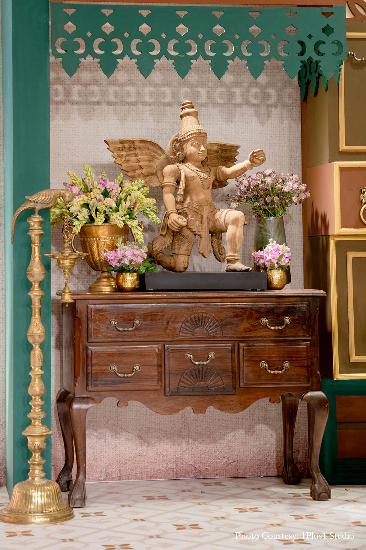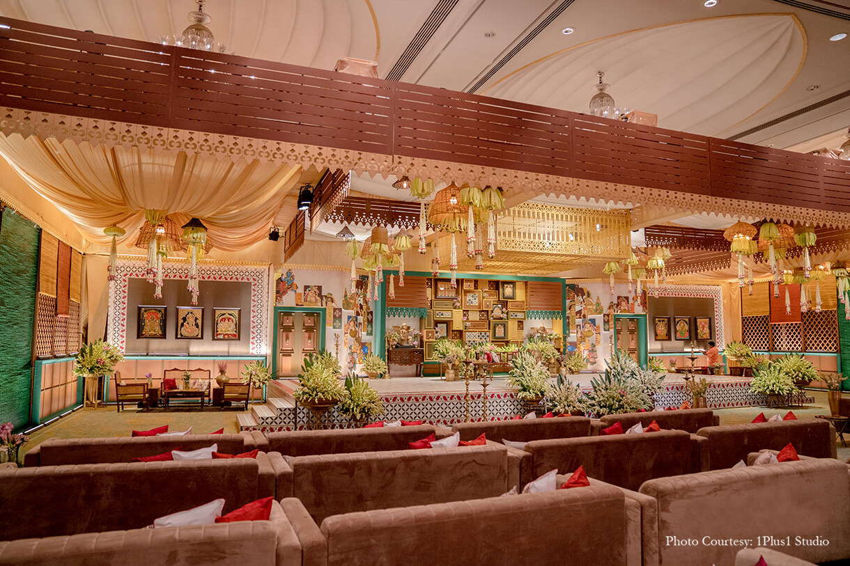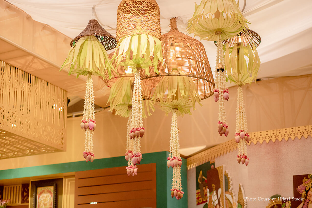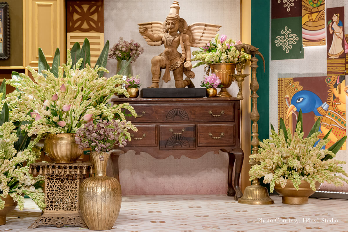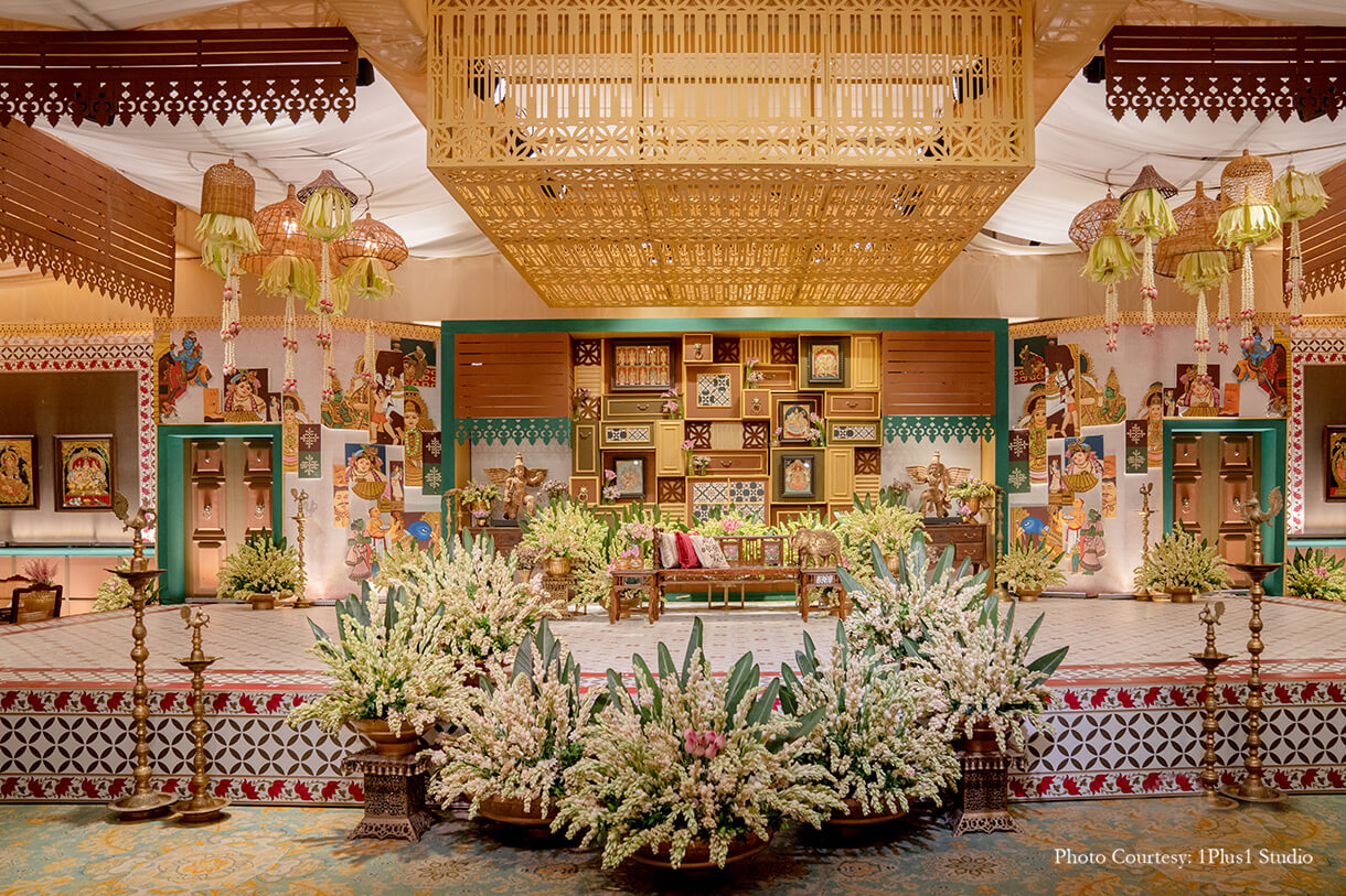 Giving us an overview of the decor, Ambika Gupta from The A-Cube Project shares, “Inspired by all things luxe and South Indian, this event was envisioned using intricate details from the Tanjore style of art. Hosted at The Leela Palace Chennai, the rich wooden textures and rustic jute details were offset by dull gold props. This set-up was further accentuated with intricate coconut weave lanterns, fragrant flower arrangements and traditional Chettinad furniture.”
