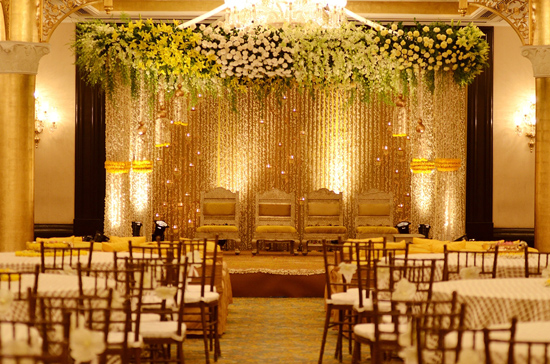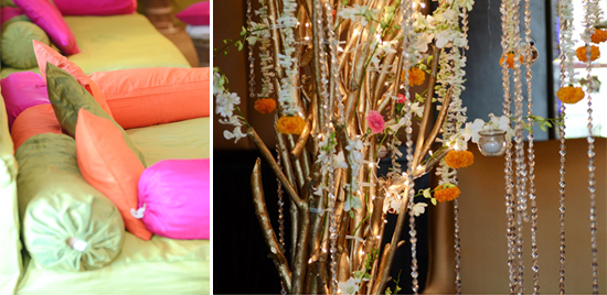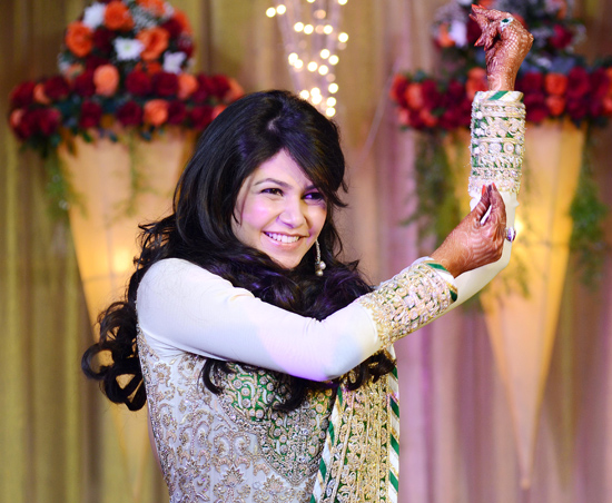 The mehndi the next day was an eclectic and colorful event where the highlight was pop colors like green, orange & pink. Though traditional flowers were used, there was a ‘fun feel’ to the decor with cone-shaped centerpieces and flowers wrapped in a banana leaf, gold twig trees with flower hangings, and hanging tea lights. The Sangeet was held at Sofitel Hotel where the decor was more dramatic, lots of red with hues of orange, gold and white. The night commenced with a small family performance, and more dance performances that continued till the wee hours of the morning. Anuja wore a beautiful white Anarkali by Abu Jani & Sandeep Khosla.