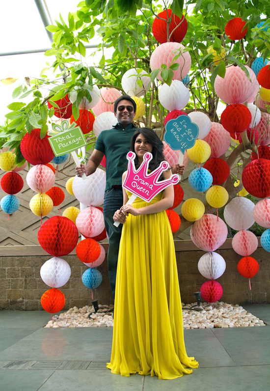 The wedding celebrations were managed by Sneh Punjabi and Radhika Gulwadi of Svaha Events, Mumbai. Says Sneh: “When Anuja approached us, she was very clear she wanted a stress-free wedding and being a perfectionist she wanted to ensure that she could enjoy herself and not sweat about the small stuff on her special day. Before the wedding we spent a lot of time to look into the decor and all the elements as she wanted every function to have a unique look and feel.” The three-day wedding festivities started with the youngsters’ brunch at Amadeus in Mumbai’s landmark destination NCPA. The theme was Western semi formal and the guests were the couple’s close friends only. Anuja looked lovely in a yellow gown and Omkar looked relaxed and dapper in blue jeans. The elements of the party included coyote dancers, a fun photo booth with customized signages and props that were ordered especially from US. Svaha Events conceptualized a unique photo booth with colorful lanterns placed on a tree making it an interesting setting for fun pictures.