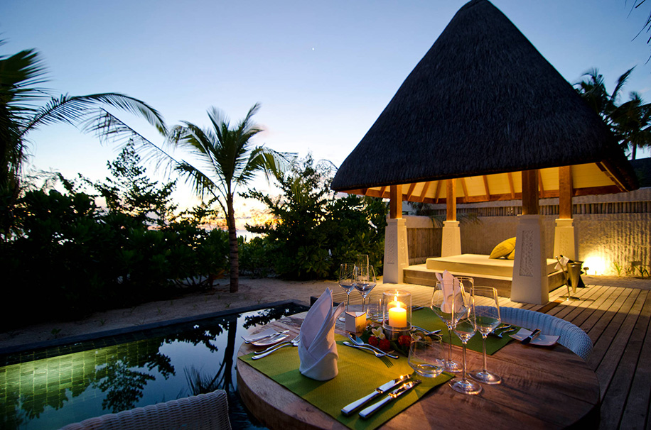 A daybed outside is perfect to watch the sunset and ready for a romantic night under the stars. The bedroom located on the mezzanine floor affords views of the sparkling lagoon. And for honeymooners or couples seeking A-list celebrity level privacy, all resort services – dining with their own private chef, in-villa spa treatments, yoga, and much more – can be provided right here, in your room.